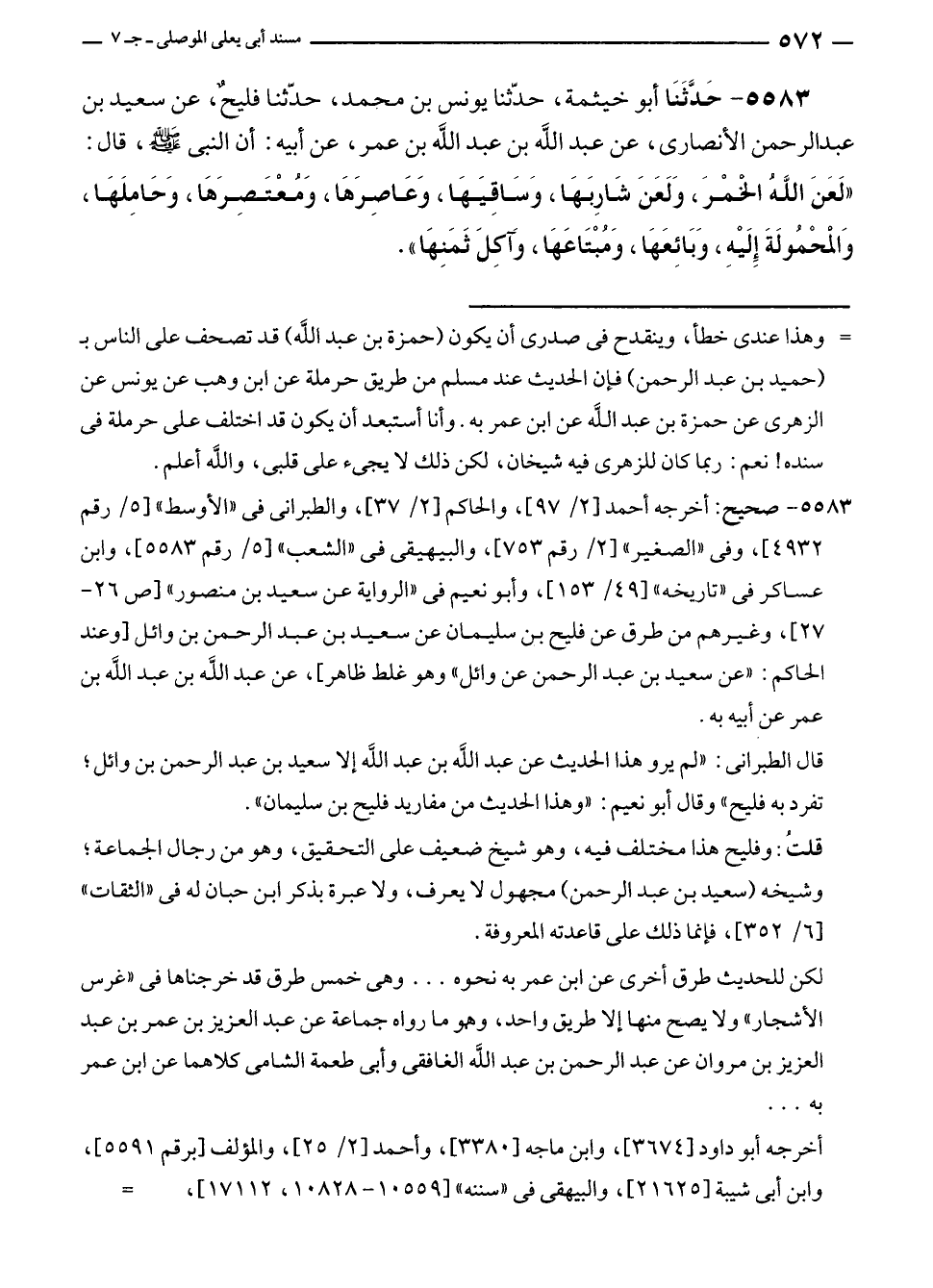 ٥٥٨٣ - حَدَّثَنَا أبو خيثمة، حدّثنا يونس بن مجمد، حدّثنا فليحٌ، عن سعيد بن عبد الرحمن الأنصارى، عن عبد الله بن عبد الله بن عمر، عن أبيه: أن النبي - صلى الله عليه وسلم -، قال: "لَعَنَ الله الخَمْرَ، وَلَعَنَ شَارِبَهَا، وَسَاقِيَهَا، وَعَاصِرَهَا، وَمُعْتَصِرَهَا، وَحَامِلَهَا، وَالمحْمُولَةَ إلَيْهِ، وَبَائِعَهَا، وَمُبْتَاعَهَا، وَآكِلَ ثَمَنِهَا".