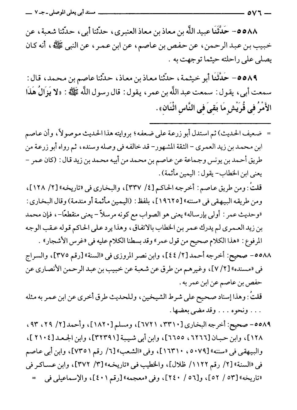 ٥٥٨٩ - حَدَّثَنَا أبو خيثمة، حدّثنا معاذ بن معاذ، حدّثنا عاصم بن محمد، قال: سمعت أبى، يقول: سمعت عبد الله بن عمر، يقول: قال رسول الله - صلى الله عليه وسلم -: "لا يَزَالُ هَذَا الأَمْرُ في قُرَيْشٍ مَا بَقِيَ في النَّاسِ اثْنَانِ".