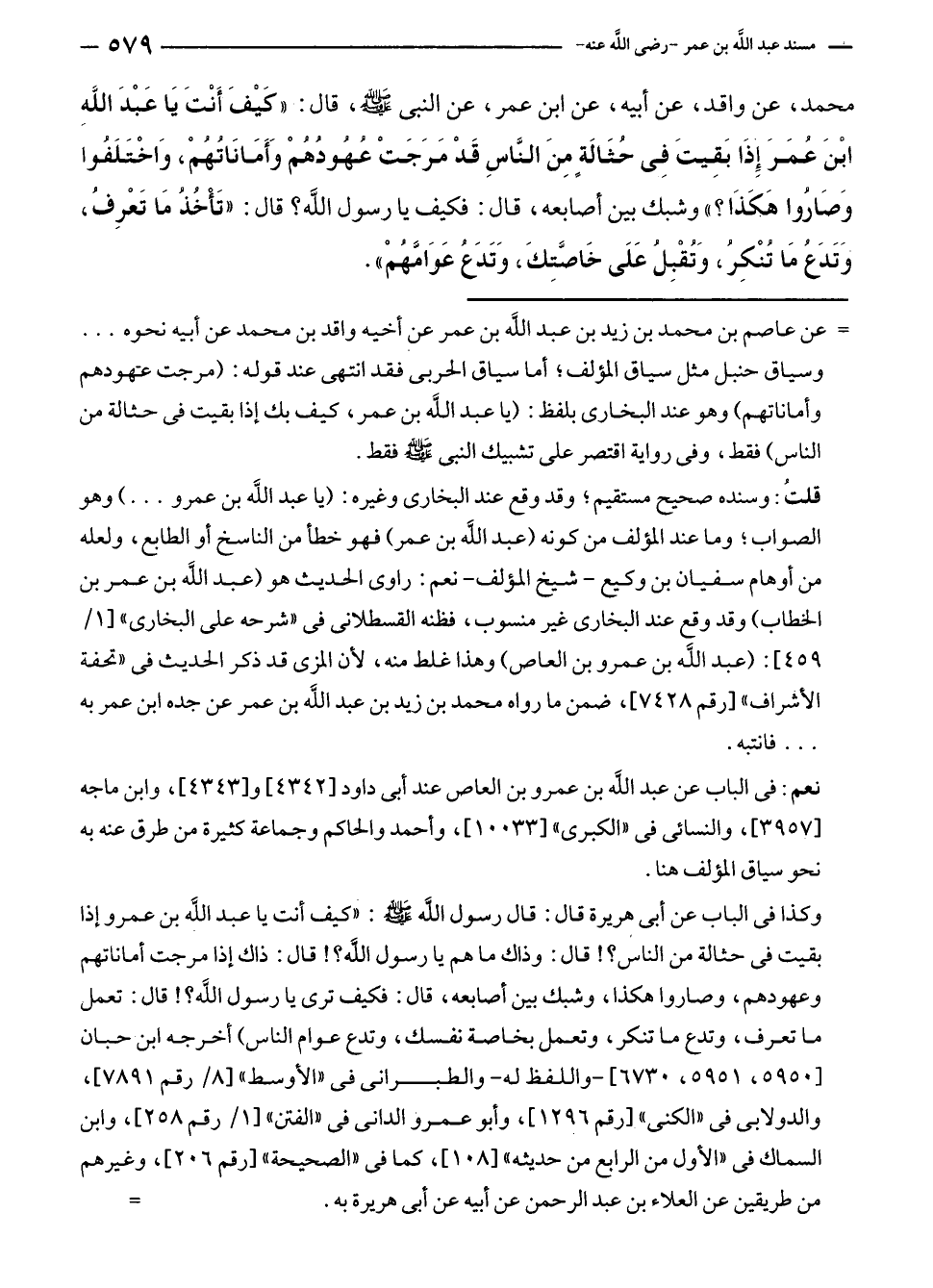 قلتُ: وسنده صحيح مستقيم؛ وقد وقع عند البخارى وغيره: (يا عبد الله بن عمرو ... ) وهو الصواب؛ وما عند المؤلف من كونه (عبد الله بن عمر) فهو خطأ من الناسخ أو الطابع، ولعله من أوهام سفيان بن وكيع - شيخ المؤلف - نعم: راوى الحديث هو (عبد الله بن عمر بن الخطاب) وقد وقع عند البخارى غير منسوب، فظنه القسطلانى في "شرحه على البخارى" [١/ ٤٥٩]: (عبد الله بن عمرو بن العاص) وهذا غلط منه، لأن المزى قد ذكر الحديث في "تحفة الأشراف" [رقم ٧٤٢٨]، ضمن ما رواه محمد بن زيد بن عبد الله بن عمر عن جده ابن عمر به ... فانتبه.