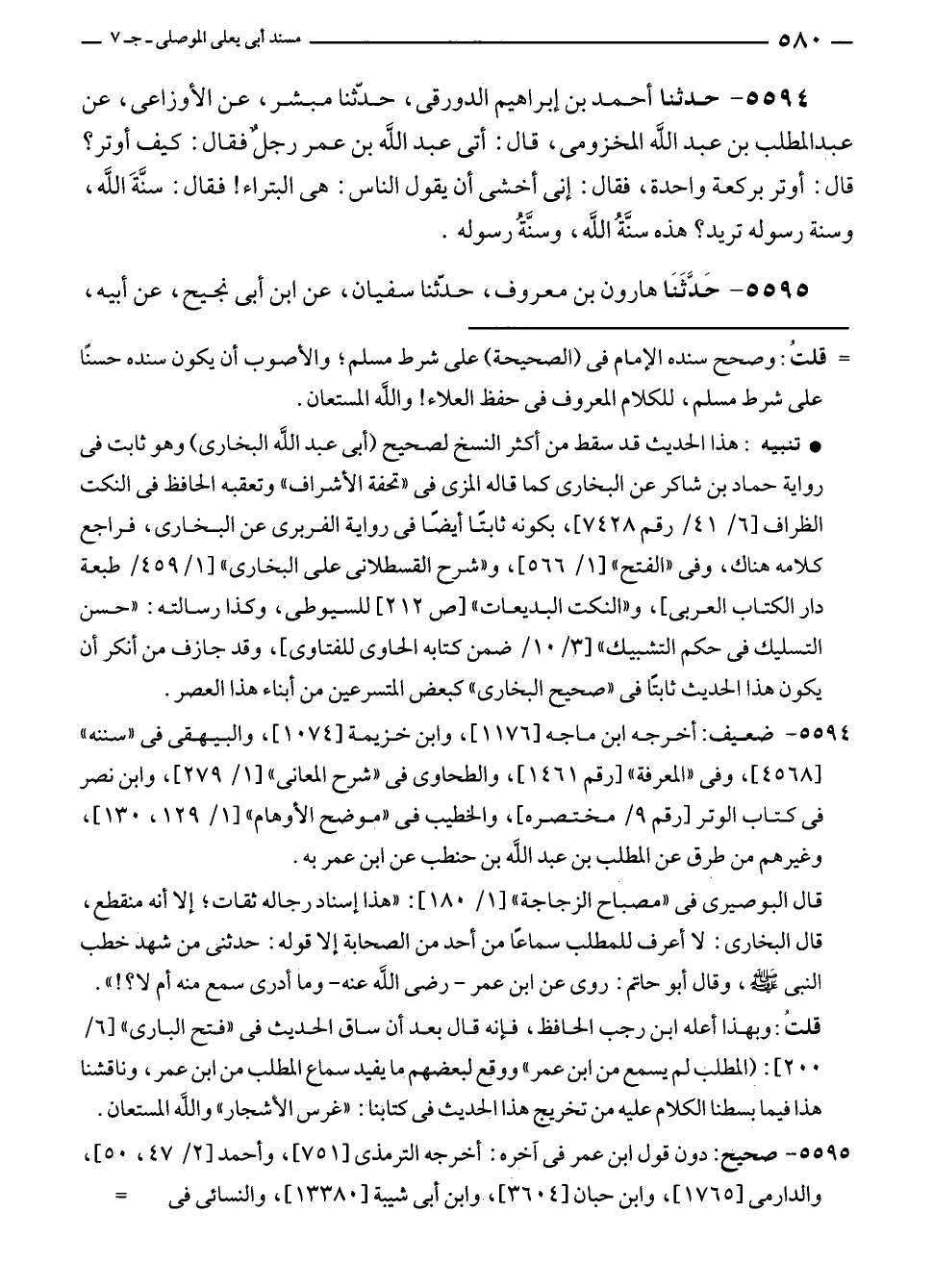 ٥٥٩٤ - حدثنا أحمد بن إبراهيم الدورقى، حدّثنا مبشر، عن الأوزاعى، عن عبد المطلب بن عبد الله المخزومى، قال: أتى عبد الله بن عمر رجل فقال: كيف أوتر؟ قال: أوتر بركعة واحدة، فقال: إنى أخشى أن يقول الناس: هي البتراء! فقال: سنَّةَ الله، وسنة رسوله تريد؟ هذه سنَّةُ الله، وسنَّةُ رسوله.