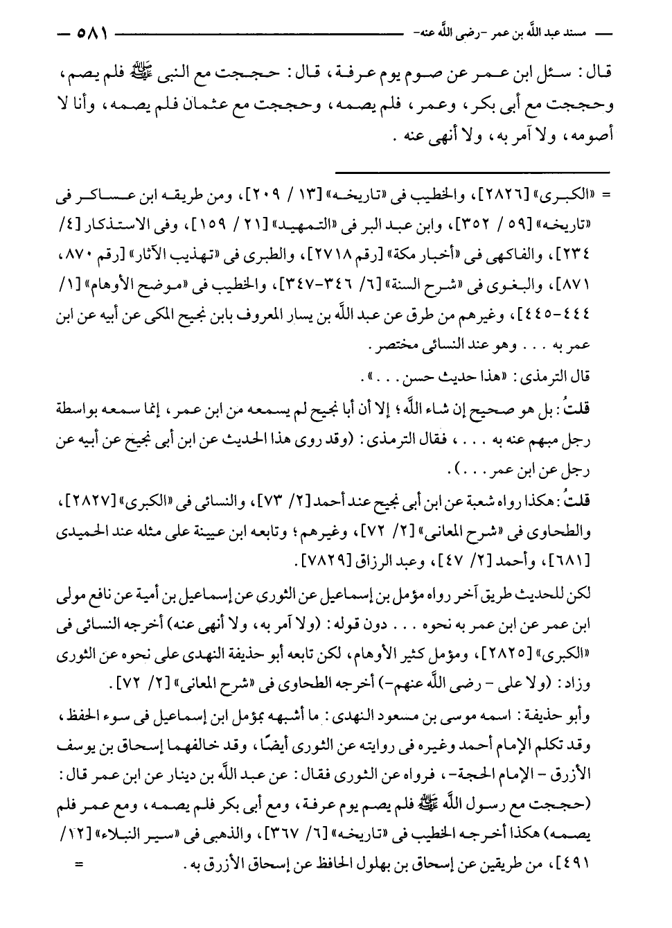 وأبو حذيفة: اسمه موسى بن مسعود النهدى: ما أشبهه بمؤمل ابن إسماعيل في سوء الحفظ، وقد تكلم الإمام أحمد وغيره في روايته عن الثورى أيضًا، وقد خالفهما إسحاق بن يوسف الأزرق - الإمام الحجة -، فرواه عن الثورى فقال: عن عبد الله بن دينار عن ابن عمر قال: (حججت مع رسول الله - صلى الله عليه وسلم - فلم يصم يوم عرفة، ومع أبى بكر فلم يصمه، ومع عمر فلم يصمه) هكذا أخرجه الخطيب في "تاريخه" [٦/ ٣٦٧]، والذهبى في "سير النبلاء" [١٢/ ٤٩١]، من طريقين عن إسحاق بن بهلول الحافظ عن إسحاق الأزرق به.=