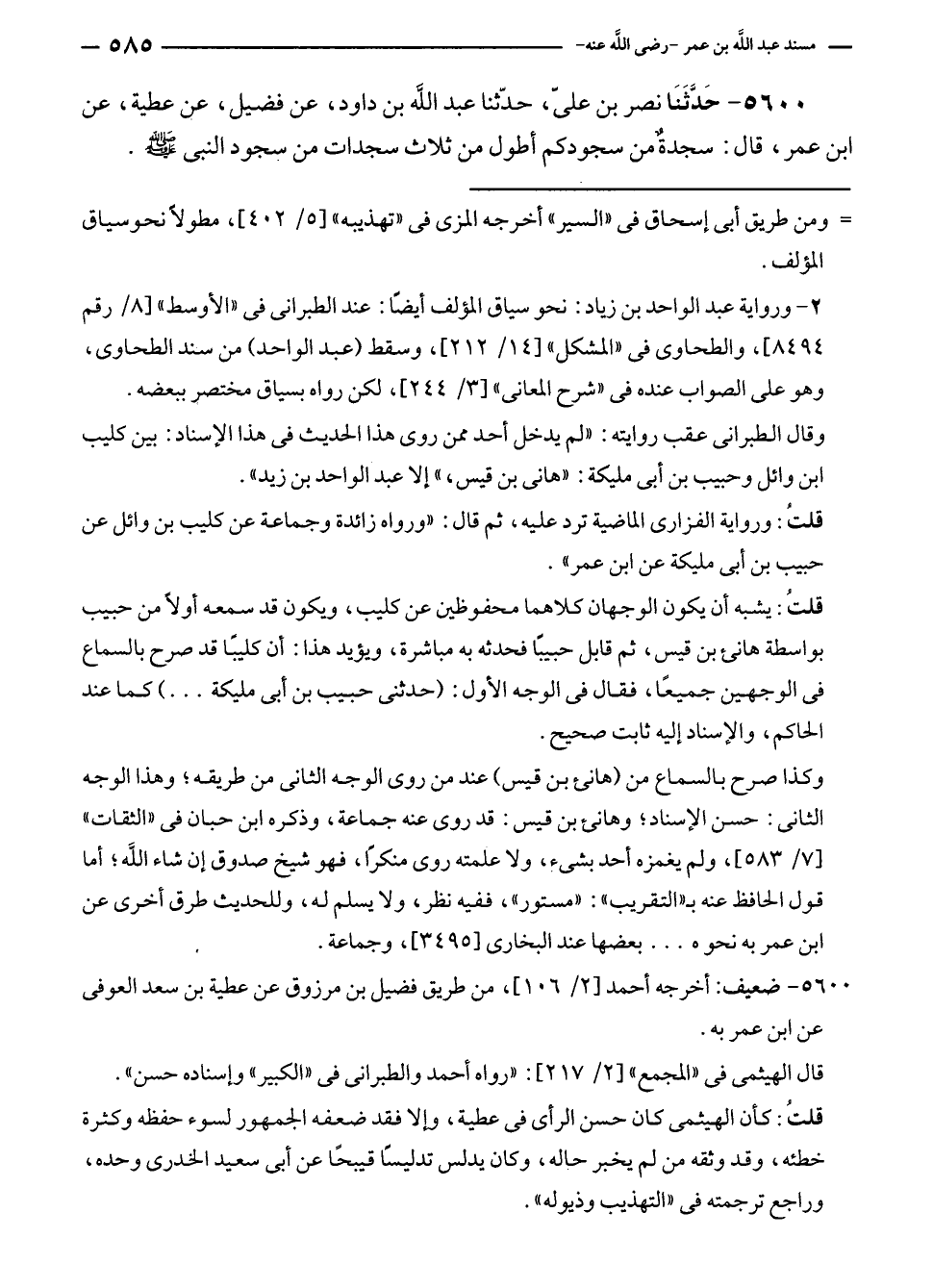 ٥٦٠٠ - حَدَّثَنَا نصر بن على، حدّثنا عبد الله بن داود، عن فضيل، عن عطية، عن ابن عمر، قال: سجدةٌ من سجودكم أطول من ثلاث سجدات من سجود النبي - صلى الله عليه وسلم -.