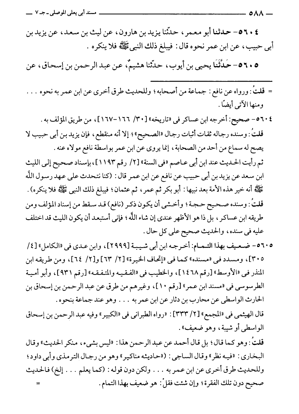 ٥٦٠٤ - حدثنا أبو معمر، حدّثنا يزيد بن هارون، عن ليث بن سعد، عن يزيد بن أبى حبيب، عن ابن عمر نحوه قال: فيبلغ ذلك النبي - صلى الله عليه وسلم - فلا ينكره.