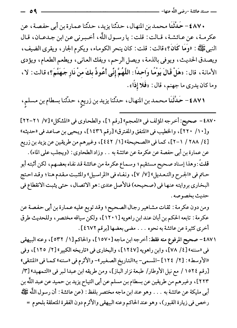 ومن دون عكرمة: ثقات مشاهير رجال الصحيح؛ وقد توبع عليه عمارة بن أبى حفصة عن عكرمة: تابعه الحكم بن أبان عند ابن راهويه [١٢٠١]، ولكن سياقه مختصر، وللحديث طرق أخرى كثيرة عن عائشة به نحوه ... مضى بعضها [برقم ٤٦٧٢].