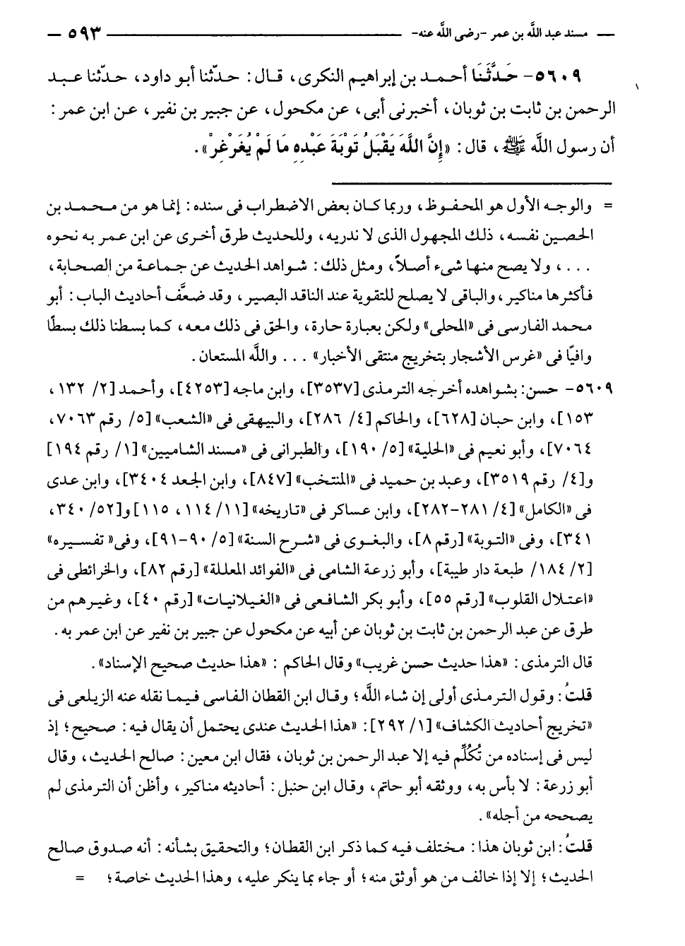 ٥٦٠٩ - حَدَّثَنَا أحمد بن إبراهيم النكرى، قال: حدّثنا أبو داود، حدّثنا عبد الرحمن بن ثابت بن ثوبان، أخبرنى أبي، عن مكحول، عن جبير بن نفير، عن ابن عمر: أن رسول الله - صلى الله عليه وسلم -، قال: "إِنَّ اللَّهَ يَقْبَلُ تَوْبَةَ عَبْدِهِ مَا لَمْ يُغَرْغِرْ".