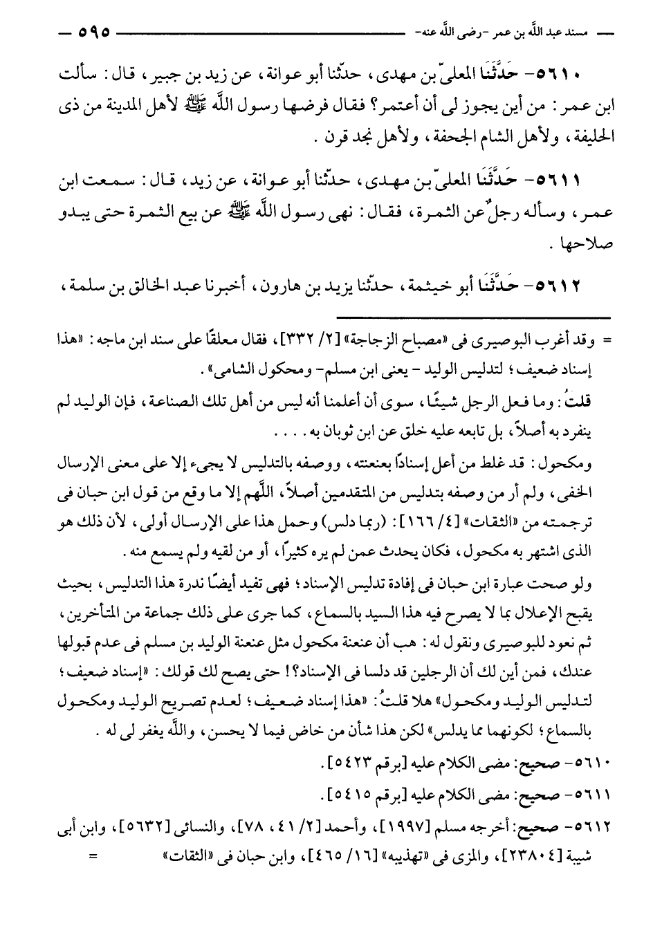 ولو صحت عبارة ابن حبان في إفادة تدليس الإسناد؛ فهى تفيد أيضًا ندرة هذا التدليس، بحيث يقبح الإعلال بما لا يصرح فيه هذا السيد بالسماع، كما جرى على ذلك جماعة من المتأخرين، ثم نعود للبوصيرى ونقول له: هب أن عنعنة مكحول مثل عنعنة الوليد بن مسلم في عدم قبولها عندك، فمن أين لك أن الرجلين قد دلسا في الإسناد؟! حتى يصح لك قولك: "إسناد ضعيف؛ لتدليس الوليد ومكحول" هلا قلتُ: "هذا إسناد ضعيف؛ لعدم تصريح الوليد ومكحول بالسماع؛ لكونهما مما يدلس" لكن هذا شأن من خاض فيما لا يحسن، واللَّه يغفر لى له.