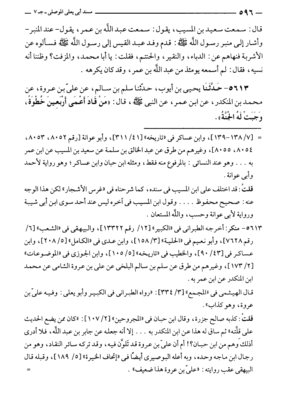 ٥٦١٣ - حَدَّثَنَا يحيى بن أيوب، حدّثنا سلم بن سالم، عن علي بن عروة، عن محمد بن المنكدر، عن ابن عمر، عن النبي - صلى الله عليه وسلم -، قال: "مَنْ قَادَ أَعْمَى أَرْبَعِينَ خطْوَةً، وَجَبَتْ لَه الْجَنَّةُ".