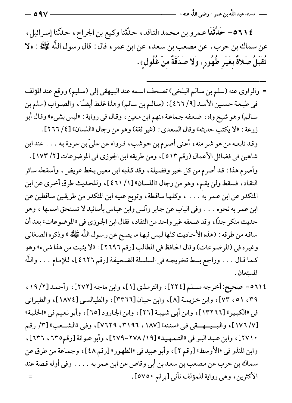 ٥٦١٤ - حَدَّثَنَا عمرو بن محمد الناقد، حدّثنا وكيع بن الجراح، حدّثنا إسرائيل، عن سماك بن حرب، عن مصعب بن سعد، عن ابن عمر، قال: قال رسول الله - صلى الله عليه وسلم -: "لا تُقْبَلُ صَلاةٌ بِغَيْرِ طُهُورٍ، وَلا صَدَقَةٌ مِنْ غُلُولٍ".