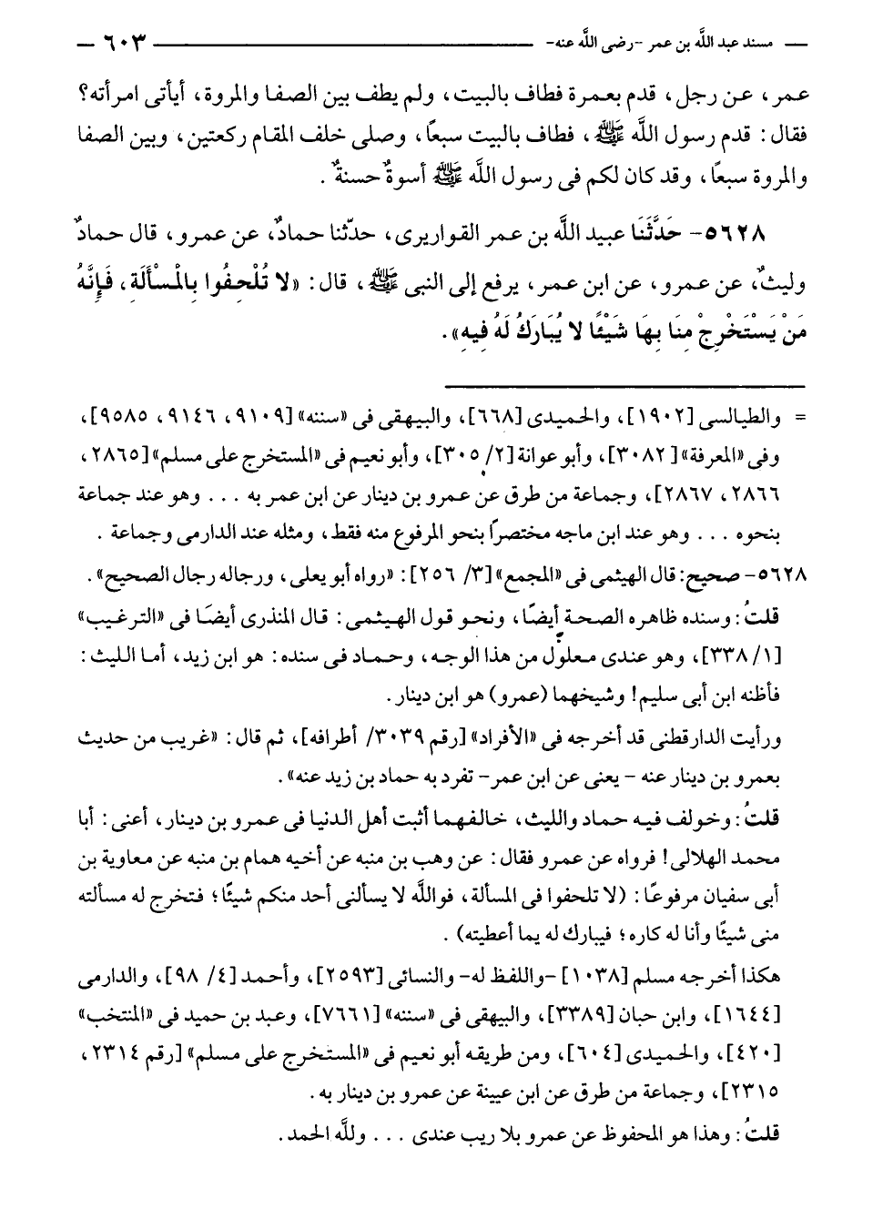٥٦٢٨ - حَدَّثَنَا عبيد الله بن عمر القواريري، حدّثنا حمادٌ، عن عمرو، قال حماد وليثٌ، عن عمرو، عن ابن عمر، يرفع إلى النبي - صلى الله عليه وسلم -، قال: "لا تُلْحِفُوا بِالمسْألَةِ، فَإِنَّهُ مَنْ يَسْتَخْرِجْ مِنَا بِهَا شَيْئًا لا يُبَارَكُ لَهُ فِيهِ".