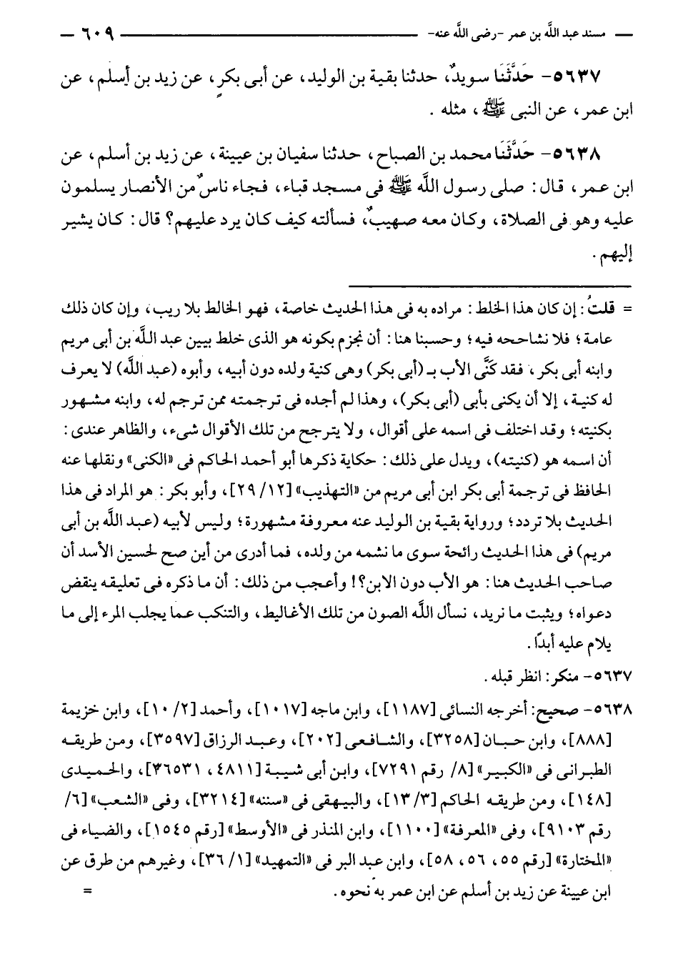 ٥٦٣٨ - حَدَّثَنَا محمد بن الصباح، حدثنا سفيان بن عيينة، عن زيدٍ بن أسلم، عن ابن عمر، قال: صلى رسول الله - صلى الله عليه وسلم - في مسجد قباء، فجاء ناسٌ من الأنصار يسلمون عليه وهو في الصلاة، وكان معه صهيبٌ، فسألته كيف كان يرد عليهم؟ قال: كان يشير إليهم.