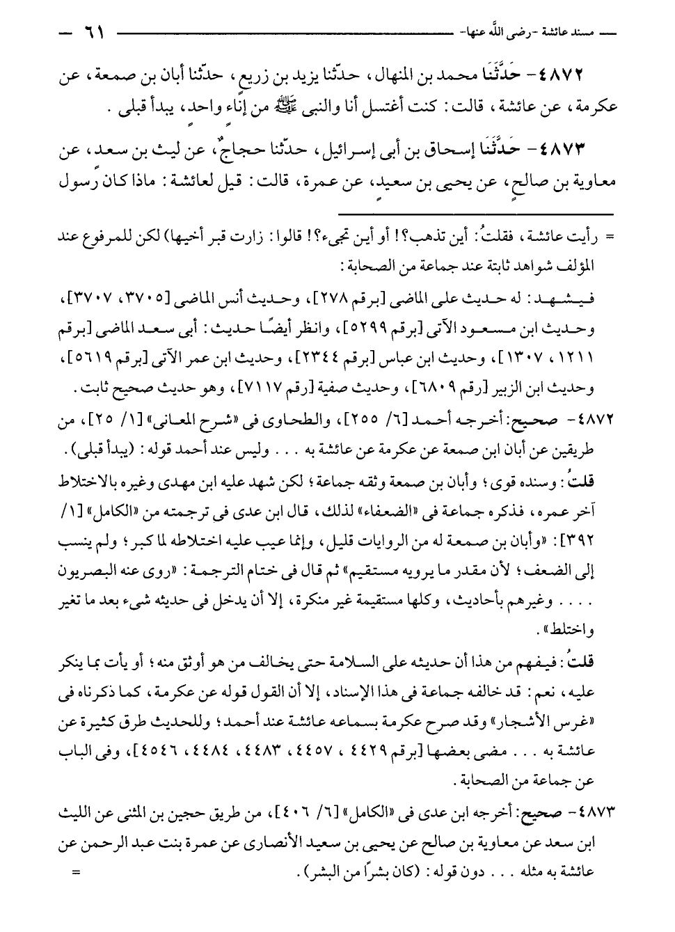 ٤٨٧٢ - حَدَّثَنَا محمد بن المنهال، حدّثنا يزيد بن زريعٍ، حدّثنا أبان بن صمعة، عن عكرمة، عن عائشة، قالت: كنت أغتسل أنا والنبى - صلى الله عليه وسلم - من إناءٍ واحدٍ، يبدأ قبلى.