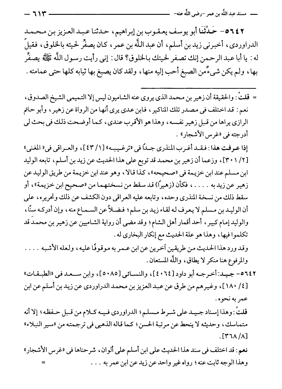 ٥٦٤٢ - حَدَّثَنَا أبو يوسف يعقوب بن إبراهيم، حدثنا عبد العزيز بن محمدٍ الدراوردي، أخبرنى زيدٍ بن أسلم، أن عبد الله بن عمر، كان يصفِّر لحيته بالخلوق، فقيل له: يا أبا عبد الرحمن إنك تصفر لحيتك بالخلوق؛ قال: إني رأيت رسول الله - صلى الله عليه وسلم - يصفِّر بها، ولم يكن شيءٌ من الصبغ أحب إليه منها، ولقد كان يصبغ بها ثيابه كلها حتى عمامته.
