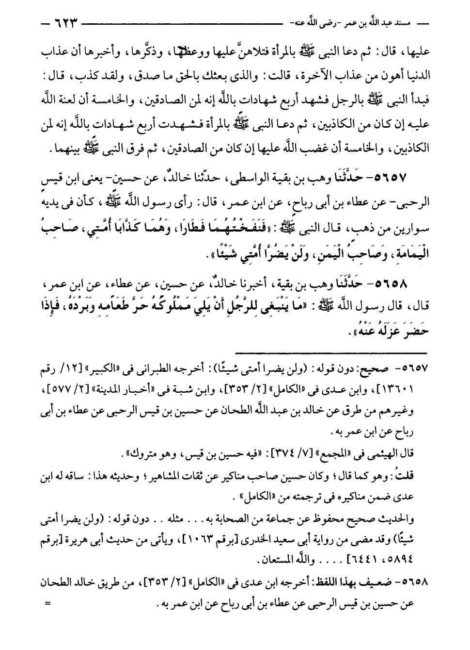 ٥٦٥٧ - حَدَّثَنَا وهب بن بقية الواسطى، حدّثنا خالدٌ، عن حسينٍ - يعنى ابن قيسٍ الرحبى - عن عطاء بن أبي رباحٍ، عن ابن عمر، قال: رأى رسول الله - صلى الله عليه وسلم -، كأن في يديه سوارين من ذهبٍ، قال النبي - صلى الله عليه وسلم -: "فَنَفَخْتُهُمَا فَطَارَا، وَهُمَا كَذَّابَا أُمَّتِي، صَاحِبُ الْيَمَامَةِ، وَصَاحِبَ الْيَمَنِ، وَلَنْ يَضُرَّا أمَّتِي شَيْئًا".