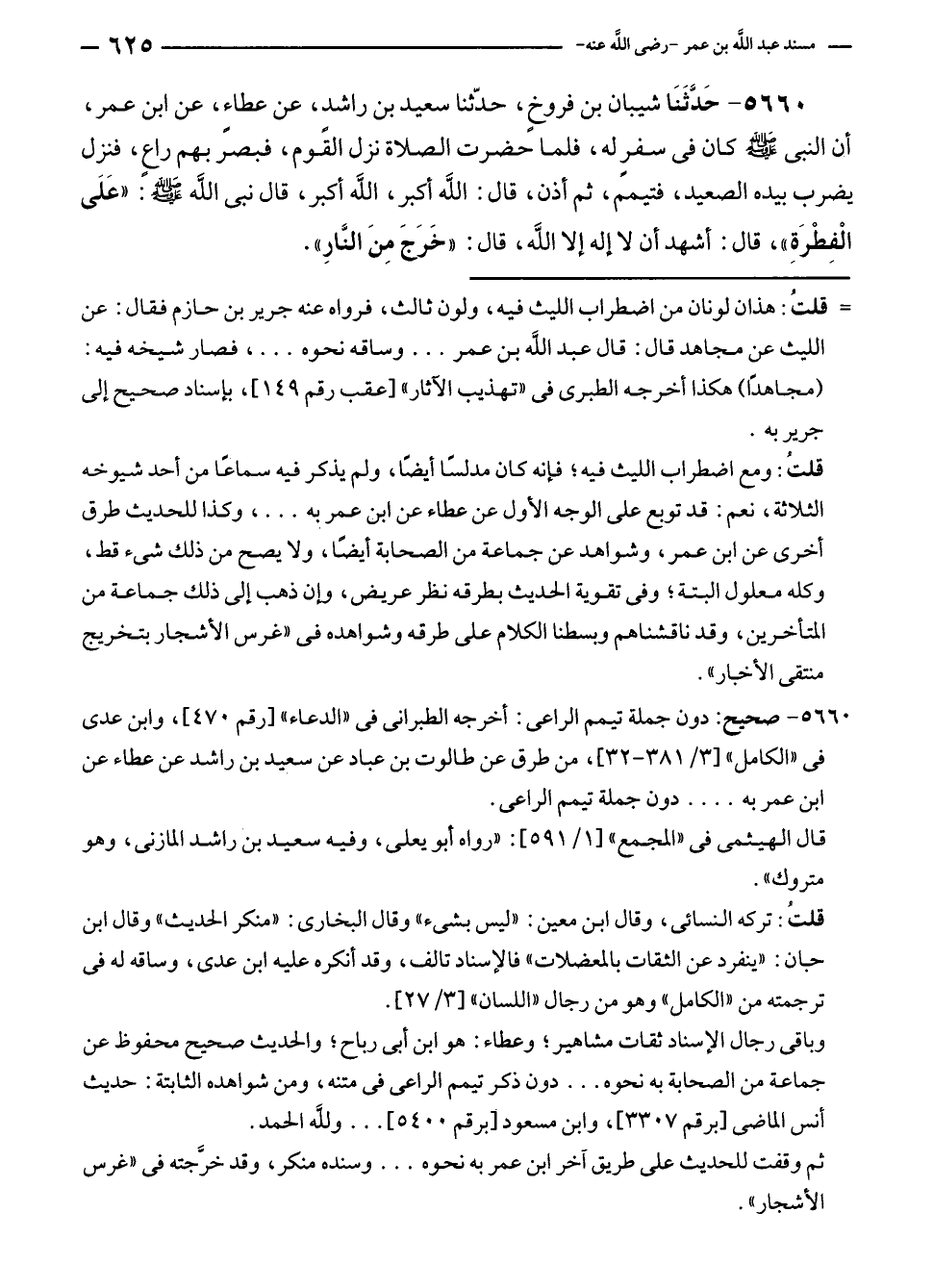 ٥٦٦٠ - حَدَّثَنَا شيبان بن فروخٍ، حدّثنا سعيد بن راشدٍ، عن عطاءٍ، عن ابن عمر، أن النبي - صلى الله عليه وسلم - كان في سفرٍ له، فلما حضرت الصلاة نزل القوم، فبصر بهم راع، فنزل يضرب بيده الصعيد، فتيمم، ثم أذن، قال: الله أكبر، الله أكبر، قال نبى الله - صلى الله عليه وسلم -: "عَلَى الْفِطْرَةِ"، قال: أشهد أن لا إله إلا الله، قال: "خَرَجَ مِنَ النَّارِ".
