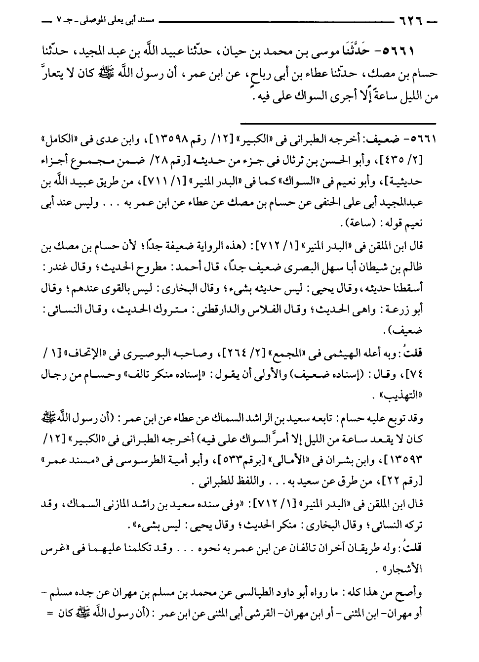 ٥٦٦١ - حَدَّثَنَا موسى بن محمد بن حيان، حدّثنا عبيد الله بن عبد المجيد، حدّثنا حسام بن مصكٍ، حدّثنا عطاء بن أبي رباحٍ، عن ابن عمر، أن رسول الله - صلى الله عليه وسلم - كان لا يتعارَّ من الليل ساعةً إلا أجرى السواك على فيه.