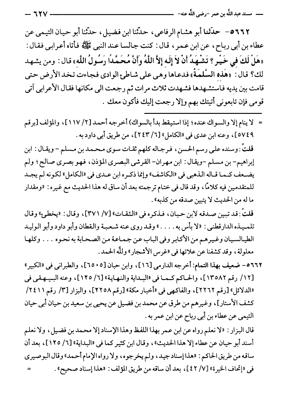 ٥٦٦٢ - حدّثنا أبو هشام الرفاعي، حدّثنا ابن فضيل، حدّثنا أبو حيان التيمي عن عطاء بن أبي رباح، عن ابن عمر، قال: كنت جالسا عند النبي - صلى الله عليه وسلم - فأتاه أعرابى فقال: "هَلْ لَكَ فِي خَيْر؟ تَشْهَدُ أَنْ لا إلَهِ إِلَّا اللَّهُ وَأَنَّ مُحَمَّدًا رَسُولُ اللَّهِ" قال: ومن يشهد لك؟ قال: "هَذِهِ السَّلمَةُ" فدعاها وهى على شاطئ الوادى فجاءت تخد الأرض حتى قامت بين يديه فاستشهدها فشهدت ثلاث مرات ثم رجعت إلى مكانها فقال الأعرابى آتى قومى فإن تابعونى أتيتك بهم وإلا رجعت إليك فأكون معك.