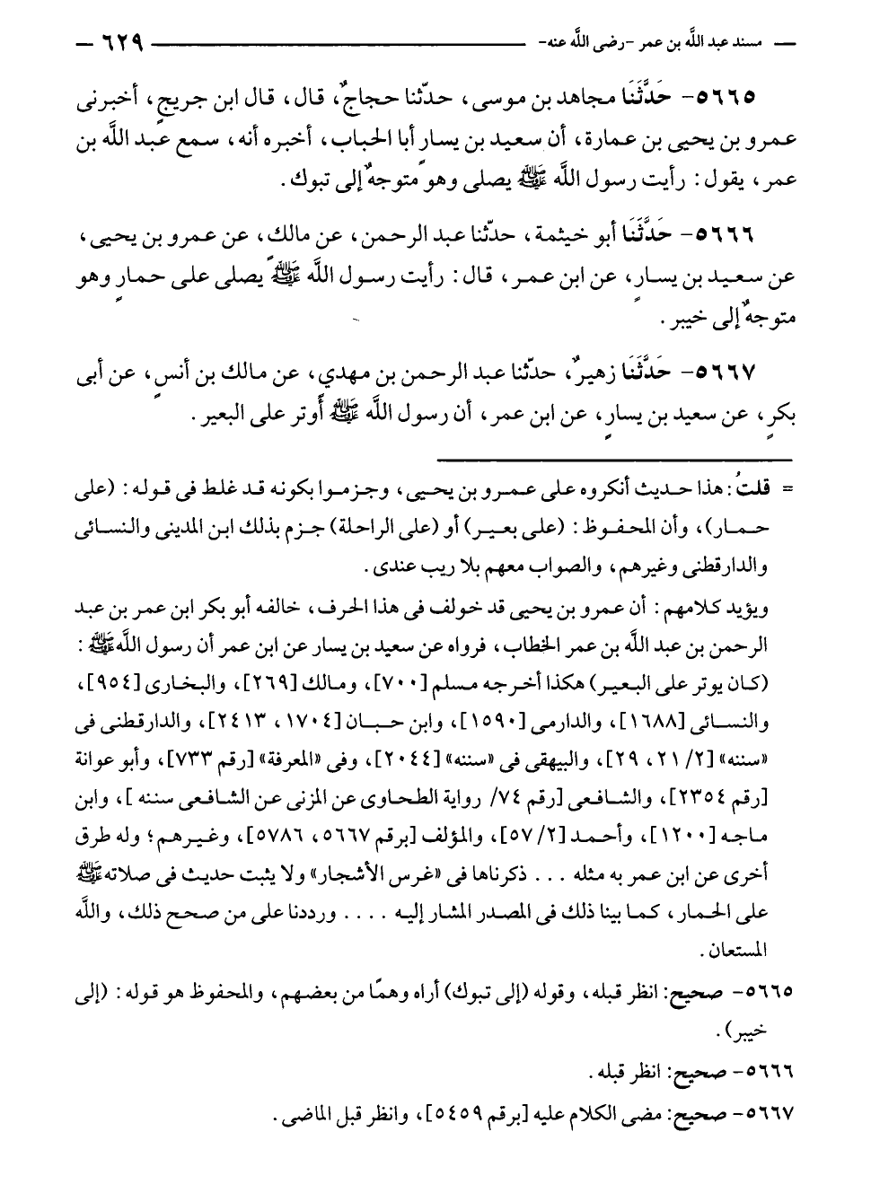ويؤيد كلامهم: أن عمرو بن يحيى قد خولف في هذا الحرف، خالفه أبو بكر بن عمر بن عبد الرحمن بن عبد الله بن عمر الخطاب، فرواه عن سعيد بن يسار عن ابن عمر أن رسول الله - صلى الله عليه وسلم -: (كان يوتر على البعير) هكذا أخرجه مسلم [٧٠٠]، ومالك [٢٦٩]، والبخاري [٩٥٤]، والنسائي [١٦٨٨]، والدارمي [١٥٩٠]، وابن حبان [١٧٠٤، ٢٤١٣]، والدارقطني في "سننه" [٢/ ٢١، ٢٩]، والبيهقي في "سننه" [٢٠٤٤]، وفي "المعرفة" [رقم ٧٣٣]، وأبو عوانة [رقم ٢٣٥٤]، والشافعي [رقم ٧٤/ رواية الطحاوي عن المزني عن الشافعي سننه]، وابن ماجه [١٢٠٠]، وأحمد [٢/ ٥٧]، والمؤلف [برقم ٥٦٦٧، ٥٧٨٦]، وغيرهم؛ وله طرق أخرى عن ابن عمر به مثله ... ذكرناها في "غرس الأشجار" ولا يثبت حديث في صلاته - صلى الله عليه وسلم - على الحمار، كما بينا ذلك في المصدر المشار إليه .... ورددنا على من صحح ذلك، واللَّه المستعان.