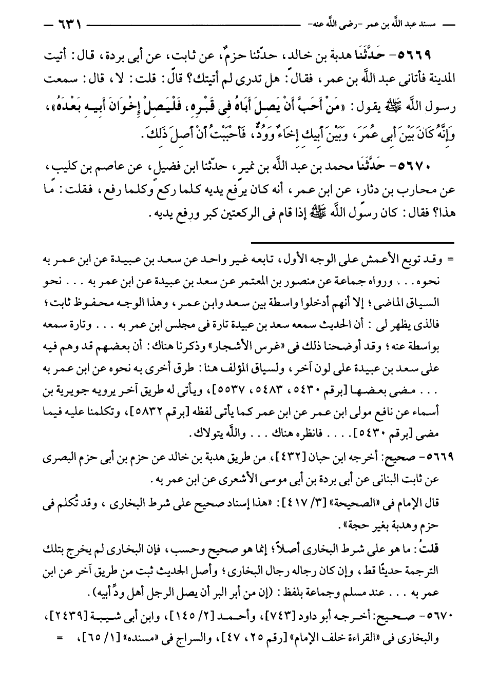 = وقد توبع الأعمش على الوجه الأول، تابعه غير واحد عن سعد بن عبيدة عن ابن عمر به نحوه .... ورواه جماعة عن منصور بن المعتمر عن سعد بن عبيدة عن ابن عمر به ... نحو السياق الماضي؛ إلا أنهم أدخلوا واسطة بين سعد وابن عمر، وهذا الوجه محفوظ ثابت؛ فالذى يظهر لى: أن الحديث سمعه سعد بن عبيدة تارة في مجلس ابن عمر به ... وتارة سمعه بواسطة عنه؛ وقد أوضحنا ذلك في "غرس الأشجار" وذكرنا هناك: أن بعضهم قد وهم فيه على سعد بن عبيدة على لون آخر، ولسياق المؤلف هنا: طرق أخرى به نحوه عن ابن عمر به ... مضى بعضها [برقم ٥٤٣٠، ٥٤٨٣، ٥٥٣٧]، ويأتى له طريق آخر يرويه جويرية بن أسماء عن نافع مولى ابن عمر عن ابن عمر كما يأتي لفظه [برقم ٥٨٣٢]، وتكلمنا عليه فيما مضى [برقم ٥٤٣٠] .... فانظره هناك ... والله يتولاك.