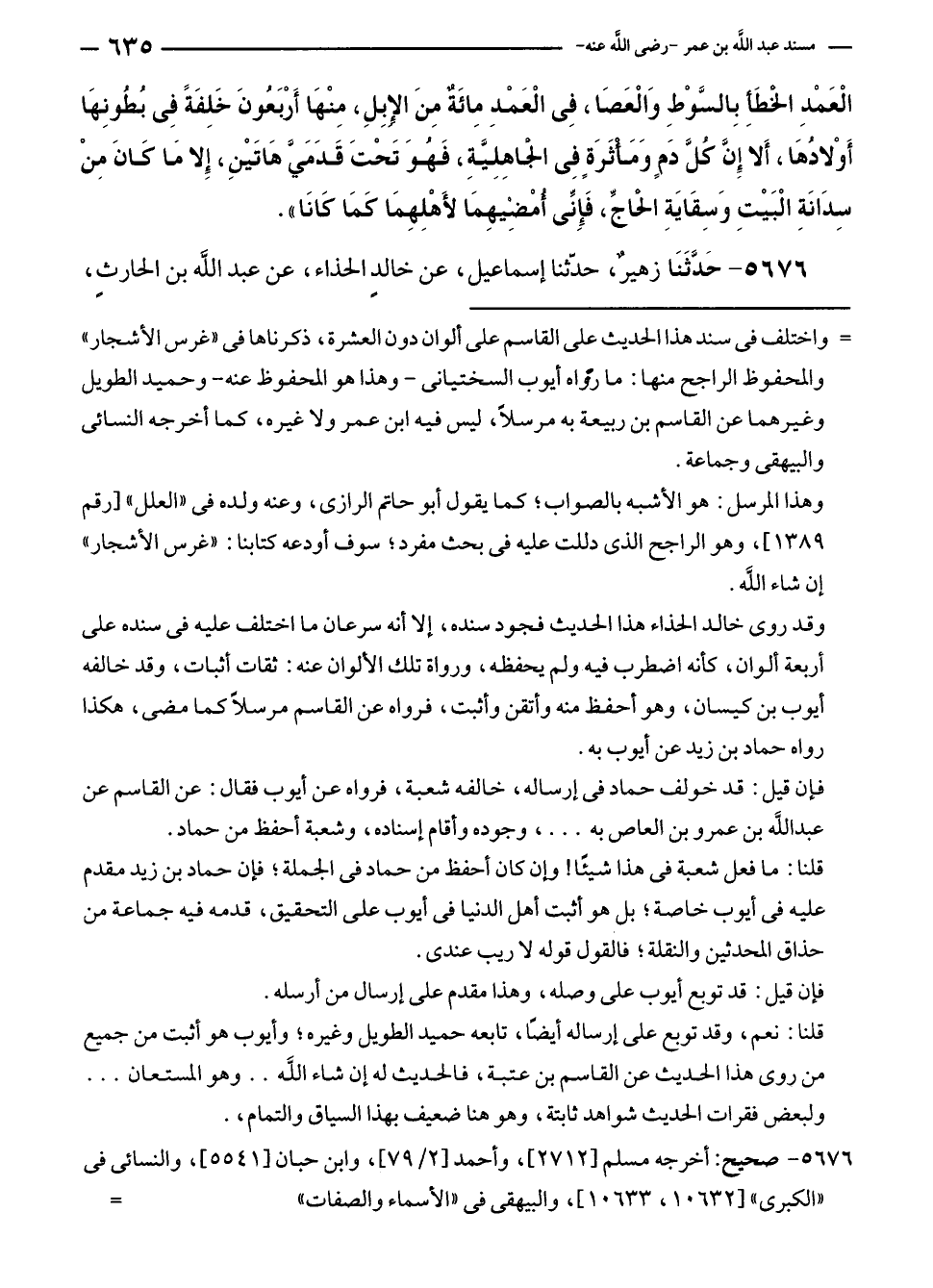 وقد روى خالد الحذاء هذا الحديث فجود سنده، إلا أنه سرعان ما اختلف عليه في سنده على أربعة ألوان، كأنه اضطرب فيه ولم يحفظه، ورواة تلك الألوان عنه: ثقات أثبات، وقد خالفه أيوب بن كيسان، وهو أحفظ منه وأتقن وأثبت، فرواه عن القاسم مرسلًا كما مضى، هكذا رواه حماد بن زيد عن أيوب به.