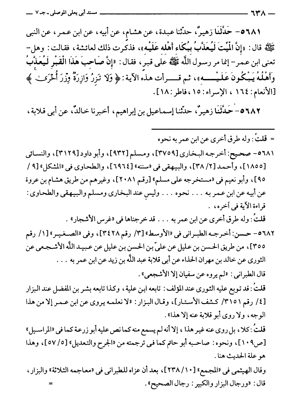 ٥٦٨١ - حَدَّثَنَا زهيرٌ، حدّثنا عبدة، عن هشامٍ، عن أبيه، عن ابن عمر، عن النبي - صلى الله عليه وسلم - قال: "إِنَّ الميِّتَ لَيُعَذَّبُ بِبُكَاءِ أَهْله عَلَيْهِ"، فذكرت ذلك لعائشة، فقالت: وهل - تعنى ابن عمر - إنما مر رسول الله - صلى الله عليه وسلم - عَلَى قبرٍ، فقال: "إِنَّ صَاحِبَ هَذَا الْقَبْرِ لَيُعَذَّبُ وَأَهْلُهُ يَبْكُونَ عَلَيْه"، ثم قرأت هذه الآية: {وَلَا تَزِرُ وَازِرَةٌ وِزْرَ أُخْرَى} [الأنعام: ١٦٤، الإسراء: ١٥، فاطر: ١٨].