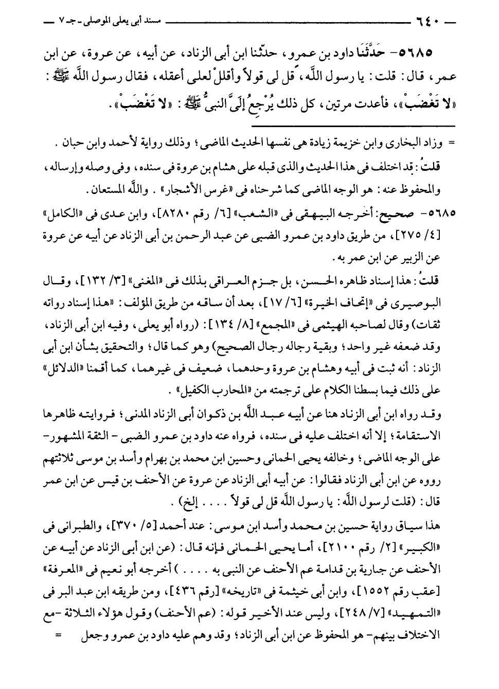 قلتُ: هذا إسناد ظاهره الحسن، بل جزم العراقى بذلك في "المغنى" [٣/ ١٣٢]، وقال البوصيرى في "إتحاف الخيرة" [٦/ ١٧]، بعد أن ساقه من طريق المؤلف: "هذا إسناد رواته ثقات" وقال لصاحبه الهيثمى في "المجمع" [٨/ ١٣٤]: (رواه أبو يعلى، وفيه ابن أبى الزناد، وقد ضعفه غير واحد؛ وبقية رجاله رجال الصحيح) وهو كما قال؛ والتحقيق بشأن ابن أبى الزناد: أنه ثبت في أبيه وهشام بن عروة وحدهما، ضعيف في غيرهما، كما أقمنا "الدلائل" على ذلك فيما بسطنا الكلام على ترجمته من "المحارب الكفيل".