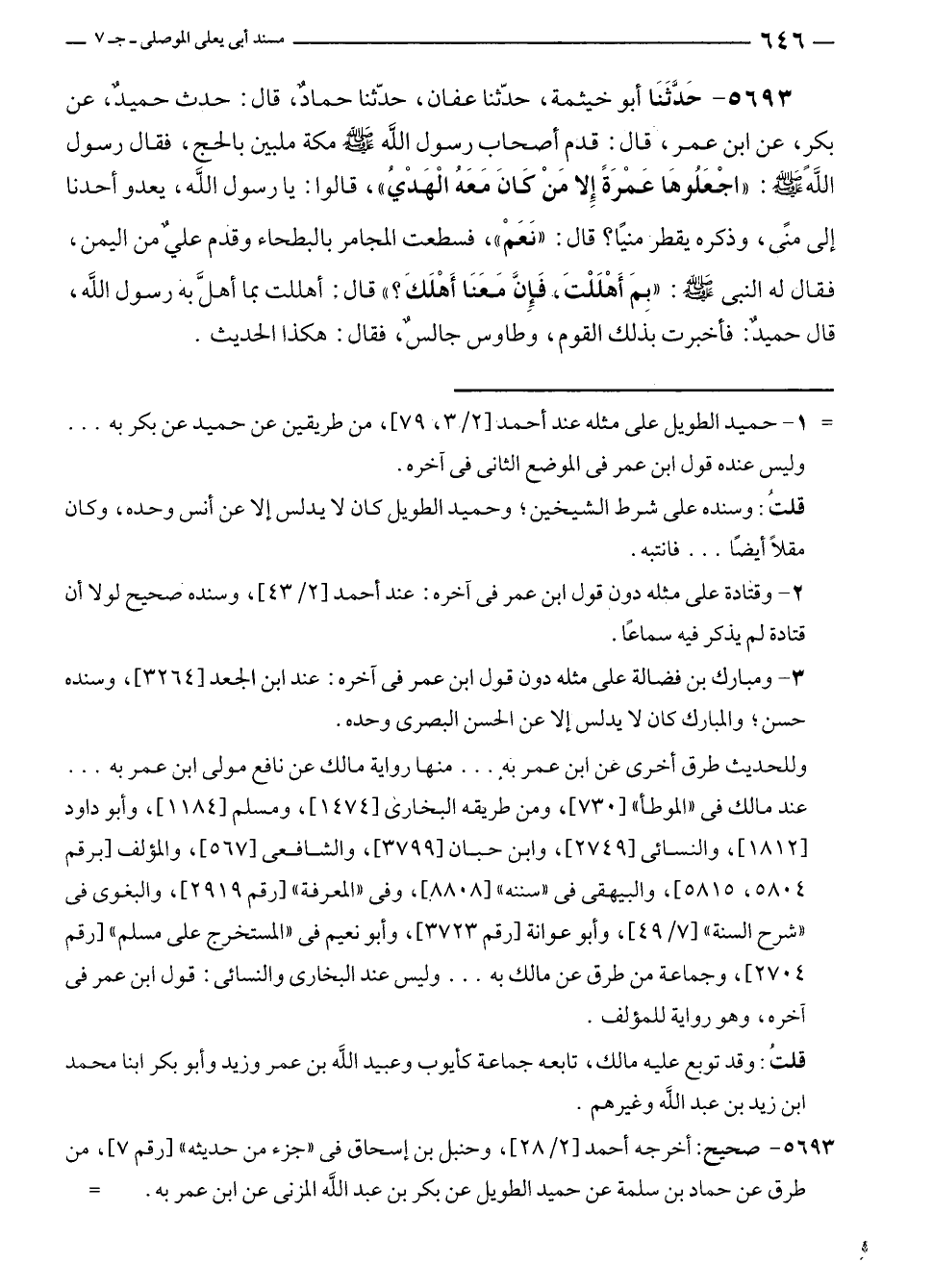 ٥٦٩٣ - حَدَّثَنَا أبو خيثمة، حدّثنا عفان، حدّثنا حمادٌ، قال: حدث حميدٌ، عن بكر، عن ابن عمر، قال: قدم أصحاب رسول الله - صلى الله عليه وسلم - مكة ملبين بالحج، فقال رسول الله - صلى الله عليه وسلم -: "اجْعَلُوهَا عَمْرَةً إلا مَنْ كَانَ مَعَهُ الْهَدْيُ"، قالوا: يا رسول الله، يعدو أحدنا إلى منًى، وذكره يقطر منيًا؟ قال: "نَعَمْ"، فسطعت المجامر بالبطحاء وقدم عليٌ من اليمن، فقال له النبي - صلى الله عليه وسلم -: "بِمَ أَهْلَلْتَ، فَإِنَّ مَعَنَا أَهْلَكَ؟ " قال: أهللت بما أهلَّ به رسول الله، قال حميدٌ: فأخبرت بذلك القوم، وطاوس جالسٌ، فقال: هكذا الحديث.