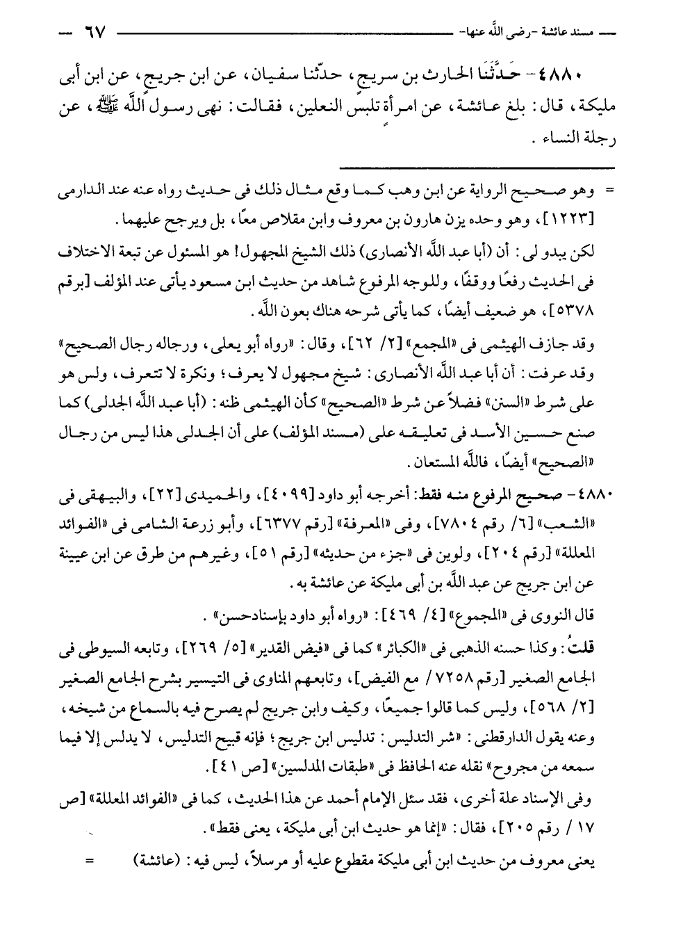 ٤٨٨٠ - حَدَّثَنَا الحارث بن سريجٍ، حدّثنا سفيان، عن ابن جريجٍ، عن ابن أبى مليكة، قال: بلغ عائشة، عن امرأةٍ تلبس النعلين، فقالت: نهى رسول الله - صلى الله عليه وسلم -، عن رجلة النساء.