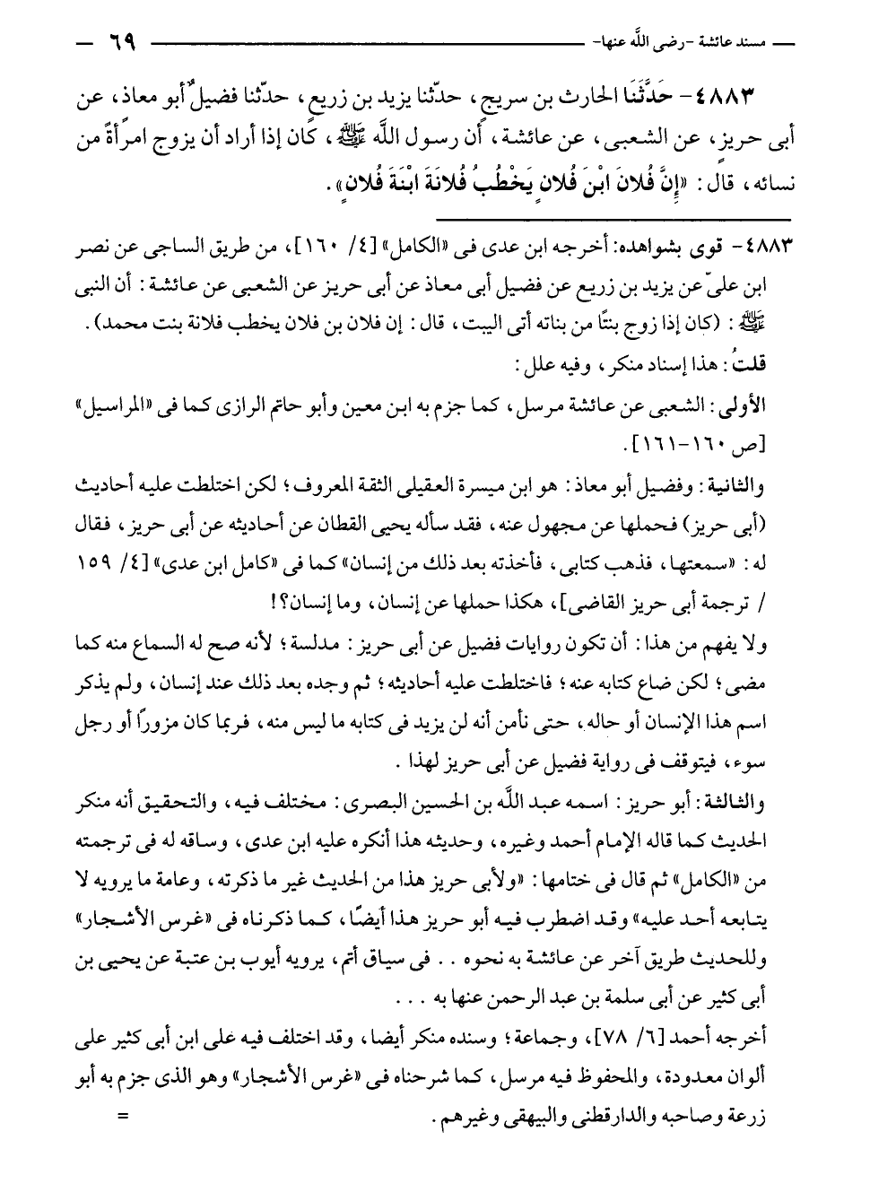 ٤٨٨٣ - حَدَّثَنَا الحارث بن سريجٍ، حدّثنا يزيد بن زريعٍ، حدّثنا فضيل أبو معاذٍ، عن أبى حريزٍ، عن الشعبى، عن عائشة، أن رسول الله - صلى الله عليه وسلم -، كان إذا أراد أن يزوج امرأةً من نسائه، قال: "إنَّ فُلانَ ابْنَ فُلانٍ يَخْطُبُ فُلانَةَ ابْنَةَ فُلانٍ".