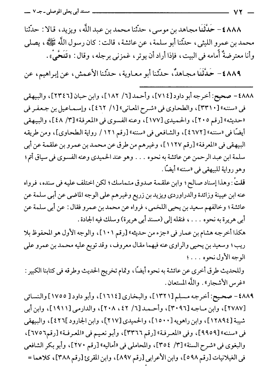 ٤٨٨٨ - صحيح: أخرجه أبو داود [٧١٤]، وأحمد [٦/ ١٨٢]، وابن حبان [٢٣٤٦]، والبيهقى في "سننه" [٣٣١٠]، والطحاوى في "شرح المعانى" [١/ ٤٦٢]، وإسماعيل بن جعفر في "حديثه" [رقم ٢٠٥]، والحميدى [١٧٧]، وعنه الفسوى في "المعرفة" [٣/ ٤٨]، والبيهقى أيضًا في "سننه" [٤٦٧٢]، والشافعى في "سننه" [رقم ١٢١/ رواية الطحاوى]، ومن طريقه البيهقى في "المعرفة" [رقم ١١٢٧]، وغيرهم من طرق عن محمد بن عمرو بن علقمة عن أبى سلمة بن عبد الرحمن عن عائشة به نحوه ... وهو عند الحميدى وعنه الفسوى في سياق أتم؛ وهو رواية للبيهقى في "سننه" أيضًا.