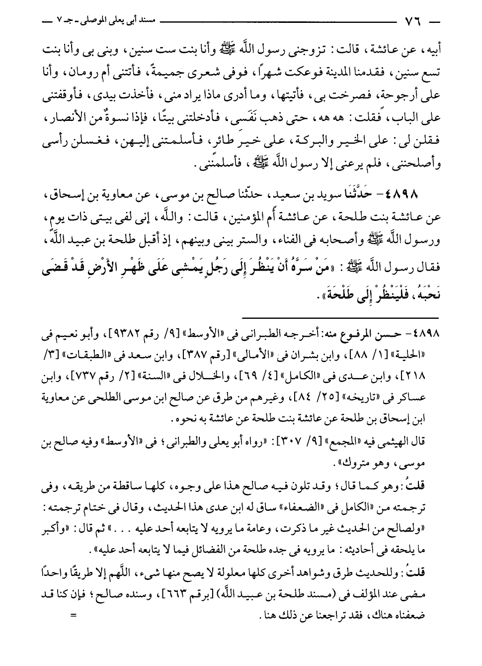 ٤٨٩٨ - حسن المرفوع منه: أخرجه الطبراني في "الأوسط" [٩/ رقم ٩٣٨٢]، وأبو نعيم في "الحلية" [١/ ٨٨]، وابن بشران في "الأمالى" [رقم ٣٨٧]، وابن سعد في "الطبقات" [٣/ ٢١٨]، وابن عدى في "الكامل" [٤/ ٦٩]، والخلال في "السنة" [٢/ رقم ٧٣٧]، وابن عساكر في "تاريخه" [٢٥/ ٨٤]، وغيرهم من طرق عن صالح ابن موسى الطلحى عن معاوية بن إسحاق بن طلحة عن عائشة بنت طلحة عن عائشة به نحوه.