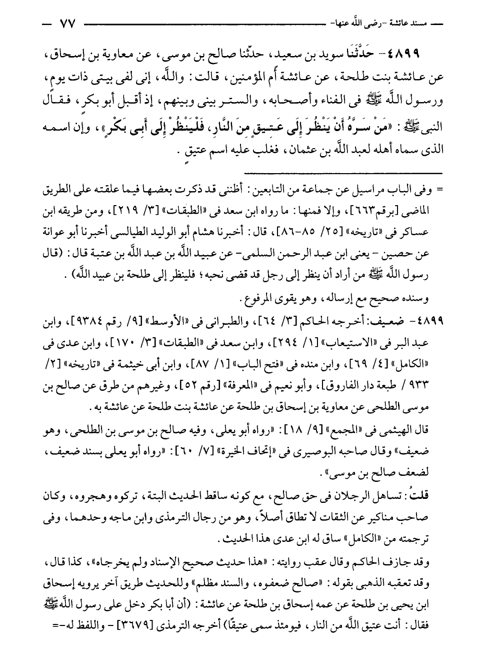 ٤٨٩٩ - حَدَّثَنَا سويد بن سعيد، حدّثنا صالح بن موسى، عن معاوية بن إسحاق، عن عائشة بنت طلحة، عن عائشة أم المؤمنين، قالت: واللَّه، إنى لفى بيتى ذات يومٍ، ورسول الله - صلى الله عليه وسلم - في الفناء وأصحابه، والستر بينى وبينهم، إذ أقبل أبو بكرٍ، فقال النبي - صلى الله عليه وسلم -: "مَنْ سَرَّهُ أَنْ يَنْظُرَ إلَى عَتِيقٍ مِنَ النَّارِ، فَلْيَنْظُرْ إلَى أَبِي بَكْرٍ"، وإن اسمه الذي سماه أهله لعبد الله بن عثمان، فغَلب عليه اسم عتيقٍ.