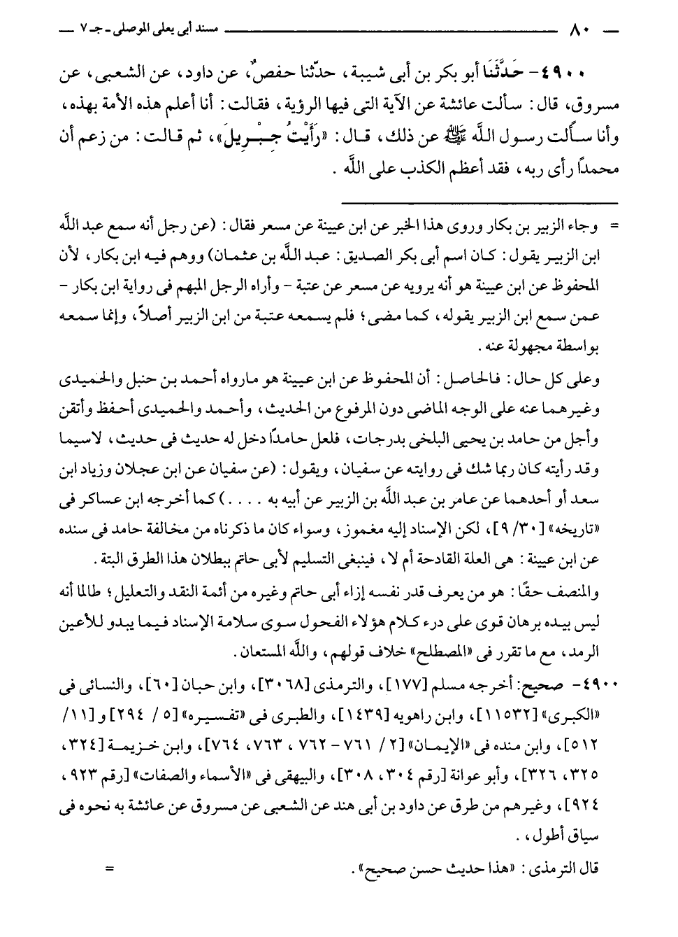 ٤٩٠٠ - صحيح: أخرجه مسلم [١٧٧]، والترمذى [٣٠٦٨]، وابن حبان [٦٠]، والنسائى في "الكبرى" [١١٥٣٢]، وابن راهويه [١٤٣٩]، والطبرى في "تفسيره" [٥/ ٢٩٤] و [١١/ ٥١٢]، وابن منده في "الإيمان" [٢/ ٧٦١ - ٧٦٢، ٧٦٣، ٧٦٤]، وابن خزيمة [٣٢٤، ٣٢٥، ٣٢٦]، وأبو عوانة [رقم ٣٠٤، ٣٠٨]، والبيهقى في "الأسماء والصفات" [رقم ٩٢٣، ٩٢٤]، وغيرهم من طرق عن داود بن أبى هند عن الشعبى عن مسروق عن عائشة به نحوه في سياق أطول].