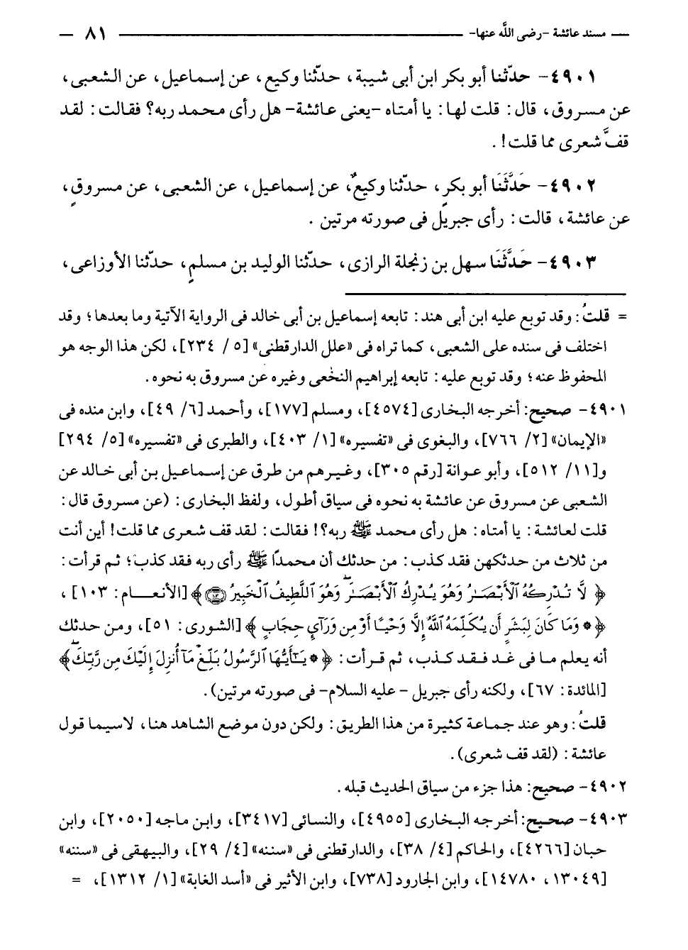 ٤٩٠٢ - حَدَّثَنَا أبو بكر، حدّثنا وكيعٌ، عن إسماعيل، عن الشعبى، عن مسروقٍ، عن عائشة، قالت: رأى جبرئل في صورته مرتين.