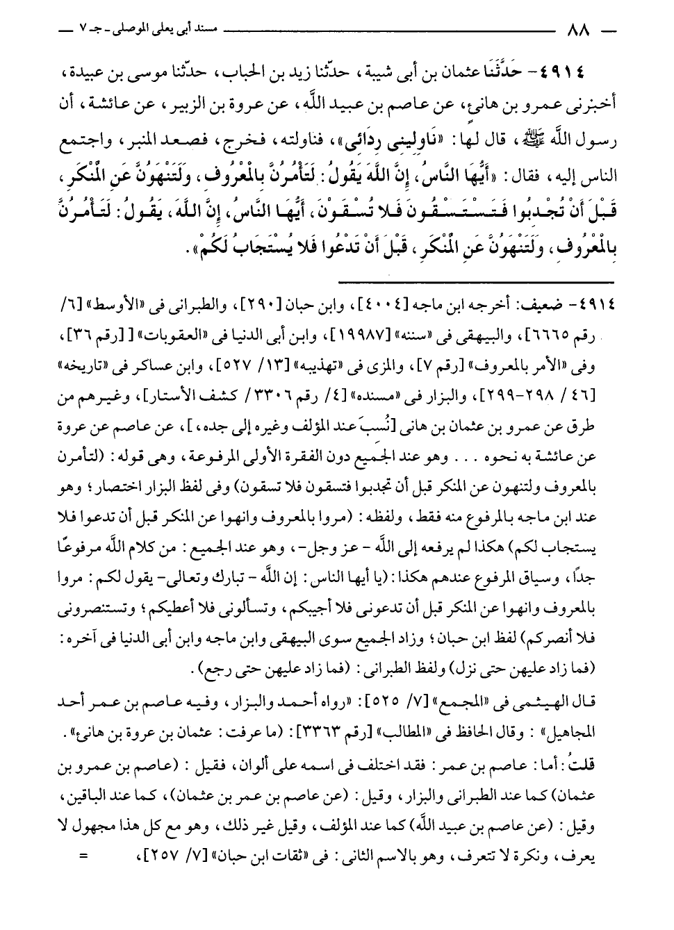 ٤٩١٤ - حَدَّثَنَا عثمان بن أبى شيبة، حدّثنا زيد بن الحباب، حدّثنا موسى بن عبيدة، أخبرنى عمرو بن هانئٍ، عن عاصم بن عبيد الله، عن عروة بن الزبير، عن عائشة، أن رسول الله - صلى الله عليه وسلم -، قال لها: "نَاوِلِينِى رِدَائِى"، فناولته، فخرج، فصعد المنبر، واجتمع الناس إليه، فقال: "أَيُّهَا النَّاسُ، إنَّ اللَّهَ يَقُولُ: لَتَأْمُرُنَّ بِالمعْروفِ، وَلَتَنْهَوُنَّ عَنِ المُنْكَرِ، قَبْلَ أَنْ تُجْدِبُوا فَتَستَسْقونَ فَلا تسْقَوْنَ، أَيُّهَا النَّاسُ، إن اللهَ، يَقُولُ: لَتَأْمُرنَّ بِالمعْرُوفِ، وَلَتَنْهَوُنَّ عَنِ المنْكَرِ، قَبْلَ أَنْ تَدْعُوا فَلا يُسْتَجَابُ لَكُمْ".