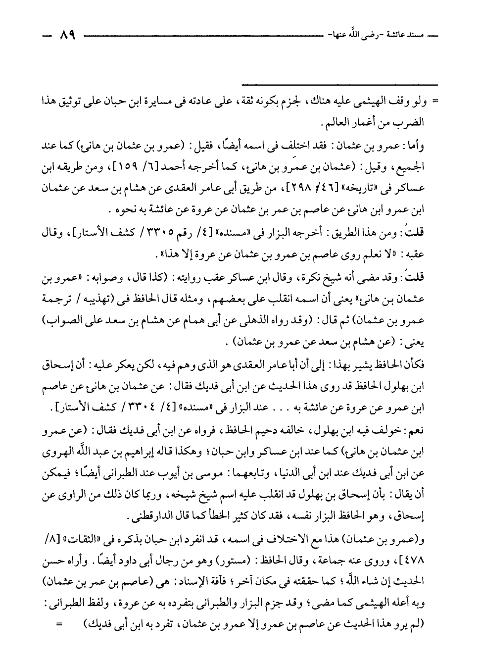 وأما: عمرو بن عثمان: فقد اختلِف في اسمه أيضًا، فقيل: (عمرو بن عثمان بن هانئ) كما عند الجميع، وقيل: (عثمان بن عمرو بن هانئ، كما أخرجه أحمد [٦/ ١٥٩]، ومن طريقه ابن عساكر في "تاريخه" [٤٦/ ٢٩٨]، من طريق أبى عامر العقدى عن هشام بن سعد عن عثمان بن عمرو بن هانئ عن عاصم بن عمر بن عثمان عن عروة عن عائشة به نحوه.