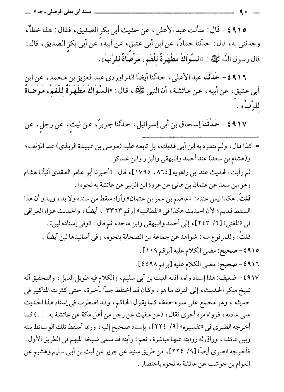 ٤٩١٥ - قَالَ: سألت عبد الأعلى، عن حديث أبى بكرٍ الصديق، فقال: هذا خطأٌ، وحدثنى به، قال: حدّثنا حمادٌ، عن ابن أبى عتيقٍ، عن أبيه، عن أبى بكرٍ الصديق، قال: قال رسول الله - صلى الله عليه وسلم -: "السِّوَاكُ مَطْهَرَةٌ لِلْفَمِ، مَرْضَاةٌ لِلرَّبِّ".