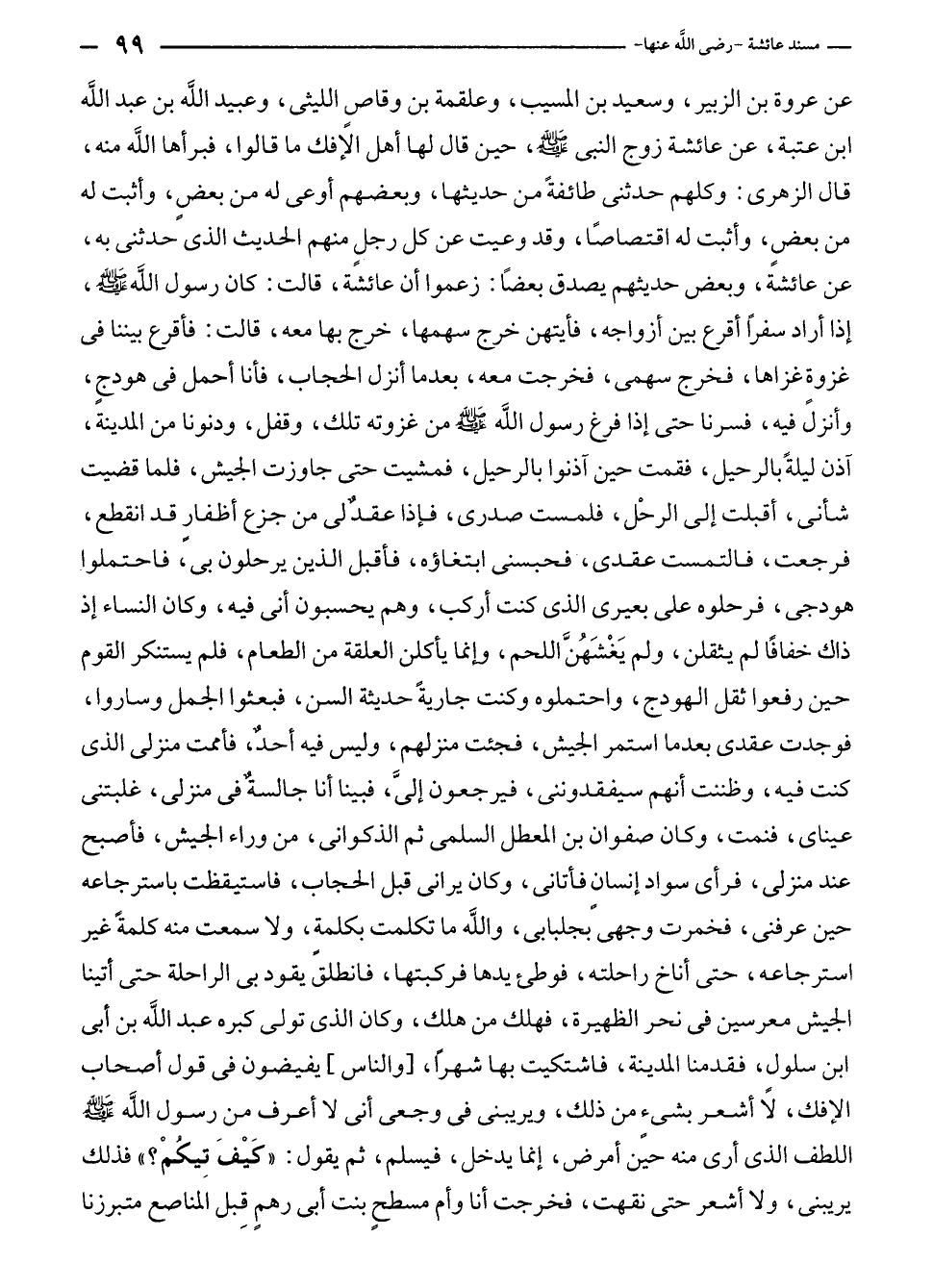 عن عروة بن الزبير، وسعيد بن المسيب، وعلقمة بن وقاص الليثى، وعبيد الله بن عبد الله بن عتبة، عن عائشة زوج النبي - صلى الله عليه وسلم -، حين قال لها أهل الإفك ما قالوا، فبرأها الله منه، قال الزهرى: وكلهم حدثنى طائفةً من حديثها، وبعضهم أوعى له من بعضٍ، وأثبت له من بعضٍ، وأثبت له اقتصاصًا، وقد وعيت عن كل رجلٍ منهم الحديث الذي حدثنى به، عن عائشة، وبعض حديثهم يصدق بعضًا: زعموا أن عائشة، قالت: كان رسول الله - صلى الله عليه وسلم -، إذا أراد سفرًا أقرع بين أزواجه، فأيتهن خرج سهمها، خرج بها معه، قالت: فأقرع بيننا في غزوة غزاها، فخرج سهمى، فخرجت معه، بعدما أنزل الحجاب، فأنا أحمل في هودجٍ، وأنزلً فيه، فسرنا حتى إذا فرغ رسول الله - صلى الله عليه وسلم - من غزوته تلك، وقفل، ودنونا من المدينة، آذن ليلةً بالرحيل، فقمت حين آذنوا بالرحيل، فمشيت حتى جاوزت الجيش، فلما قضيت شأنى، أقبلت إلى الرحْل، فلمست صدرى، فإذا عقدٌ لي من جزع أظفارٍ قد انقطع، فرجعت، فالتمست عقدى، فحبسنى ابتغاؤه، فأقبل الذين يرحلون بى، فاحتملوا هودجى، فرحلوه على بعيرى الذي كنت أركب، وهم يحسبون أنى فيه، وكان النساء إذ ذاك خفافًا لم يثقلن، ولم يَغْشَهُنَّ اللحم، وإنما يأكلن العلقة من الطعام، فلم يستنكر القوم حين رفعوا ثقل الهودج، واحتملوه وكنت جاريةً حديثة السن، فبعثوا الجمل وساروا، فوجدت عقدى بعدما استمر الجيش، فجئت منزلهم، وليس فيه أحد، فأممت منزلى الذي كنت فيه، وظننت أنهم سيفقدوننى، فيرجعون إليَّ، فبينا أنا جالسة في منزلى، غلبتنى عيناى، فنمت، وكان صفوان بن المعطل السلمى ثم الذكوانى، من وراء الجيش، فأصبح عند منزلى، فرأى سواد إنسان فأتانى، وكان يرانى قبل الحجاب، فاستيقظت باسترجاعه حين عرفنى، فخمرت وجهى بجلبابى، واللَّه ما تكلمت بكلمة، ولا سمعت منه كلمة غير استرجاعه، حتى أناخ راحلته، فوطئ يدها فركبتها، فانطلق يقود بى الراحلة حتى أتينا الجيش معرسين في نحر الظهيرة، فهلك من هلك، وكان الذي تولى قبره عبد الله بن أبى بن سلول، فقدمنا المدينة، فاشتكيت بها شهرًا، [والناس] يفيضون في قول أصحاب الإفك، لا أشعر بشئٍ من ذلك، ويريبنى في وجعى أنى لا أعرف من رسول الله - صلى الله عليه وسلم - اللطف الذي أرى منه حين أمرض، إنما يدخل، فيسلم، ثم يقول: "كَيْفَ تِيكُمْ؟ " فذلك يريبنى، ولا أشعر حتى نقهت، فخرجت أنا وأم مسطحٍ بنت أبى رهمٍ قِبل المناصع متبرزنا