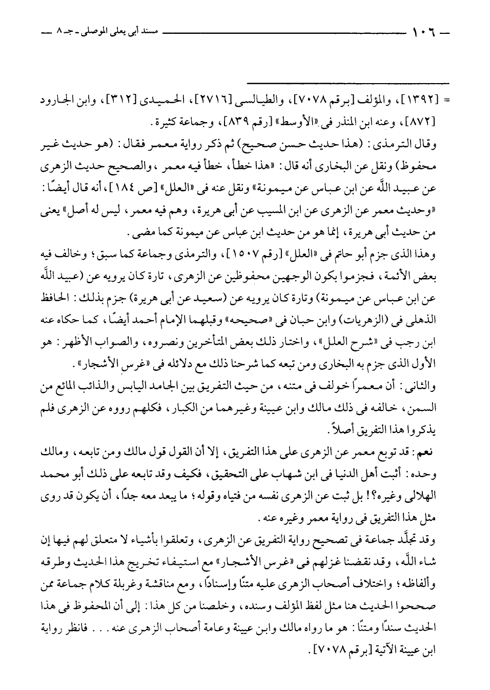 وهذا الذي جزم أبو حاتم في "العلل" [رقم ١٥٠٧]، والترمذى وجماعة كما سبق؛ وخالف فيه بعض الأئمة، فجزموا بكون الوجهين محفوظين عن الزهرى، تارة كان يرويه عن (عبيد الله عن ابن عباس عن ميمونة) وتارة كان يرويه عن (سعيد عن أبى هريرة) جزم بذلك: الحافظ الذهلى في (الزهريات) وابن حبان في "صحيحه" وقبلهما الإمام أحمد أيضًا، كما حكاه عنه ابن رجب في "شرح العلل"، واختار ذلك بعض المتأخرين ونصروه، والصواب الأظهر: هو الأول الذي جزم به البخارى ومن تبعه كما شرحنا ذلك مع دلائله في "غرس الأشجار".