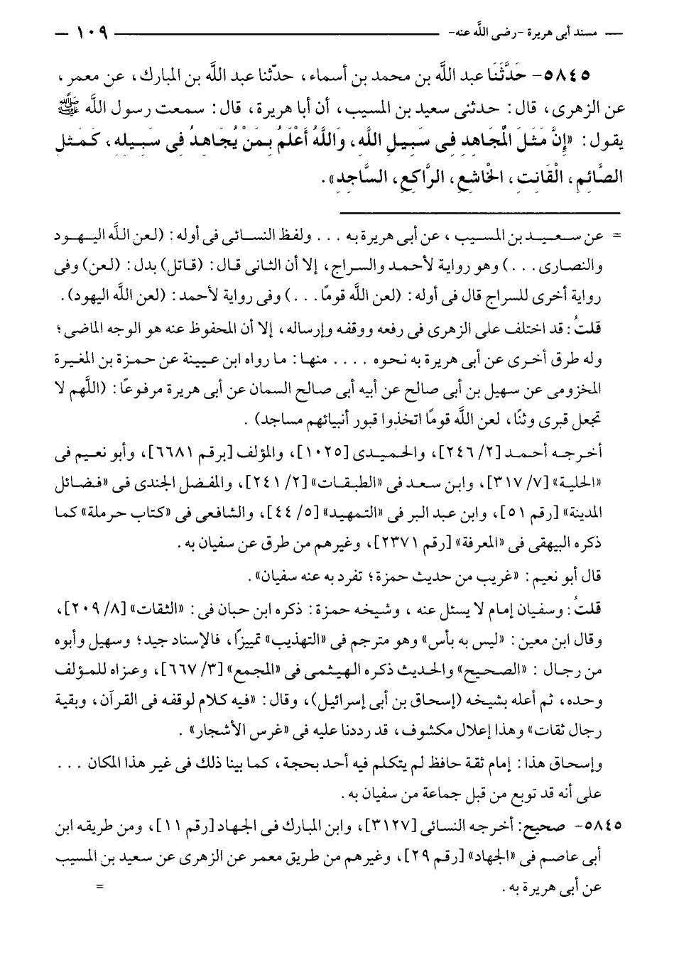 ٥٨٤٥ - صحيح: أخرجه النسائي [٣١٢٧]، وابن المبارك في الجهاد [رقم ١١]، ومن طريقه ابن أبى عاصم في "الجهاد" [رقم ٢٩]، وغيرهم من طريق معمر عن الزهرى عن سعيد بن المسيب عن أبى هريرة به.=