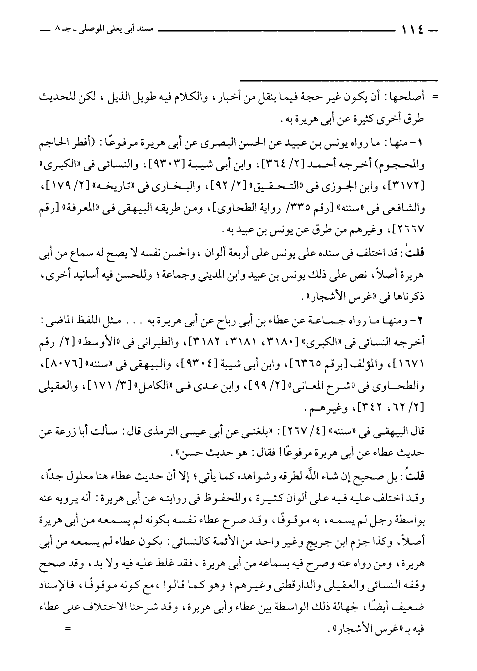 قلتُ: قد اختلف في سنده على يونس على أربعة ألوان، والحسن نفسه لا يصح له سماع من أبى هريرة أصلًا، نص على ذلك يونس بن عبيد وابن المدينى وجماعة؛ وللحسن فيه أسانيد أخرى، ذكرناها في "غرس الأشجار".