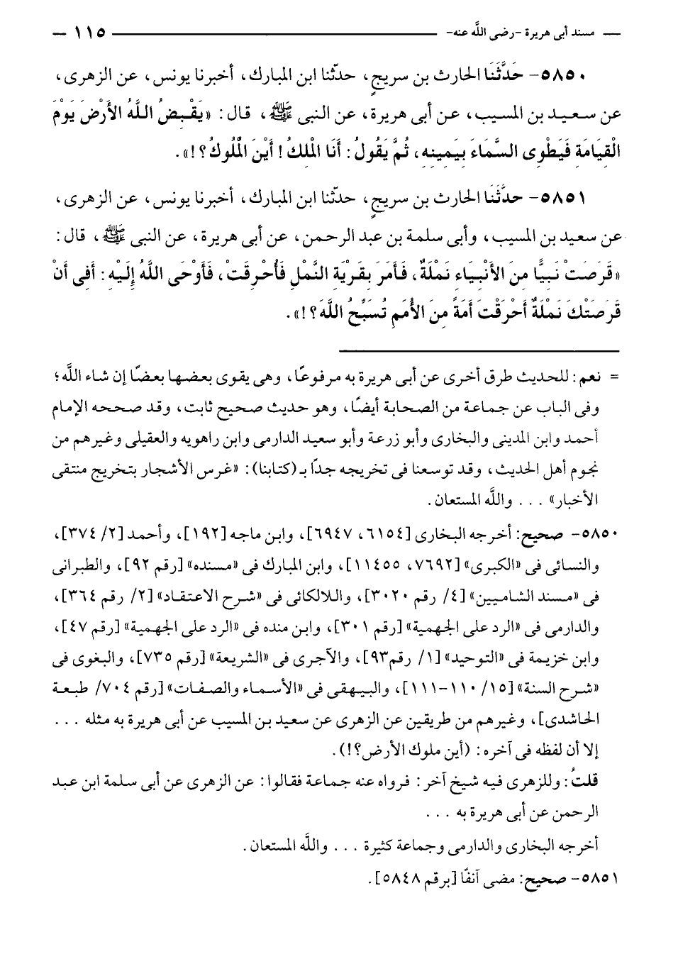 ٥٨٥١ - حدَّثَنَا الحارث بن سريجٍ، حدّثنا ابن المبارك، أخبرنا يونس، عن الزهرى، عن سعيد بن المسيب، وأبى سلمة بن عبد الرحمن، عن أبى هريرة، عن النبي - صلى الله عليه وسلم -، قال: "قَرَصَتْ نَبِيًّا مِنَ الأَنْبِيَاءِ نَمْلَةٌ، فَأَمَرَ بِقَرْيَةِ النَّمْلِ فَأُحْرِقَتْ، فَأَوْحَى اللهُ إِلَيْهِ: أَفِى أَنْ قَرصَتْكَ نَمْلَةٌ أَحْرَقْتَ أمةً مِنَ الأُمَمِ تُسَبِّحُ اللَّهَ؟! ".