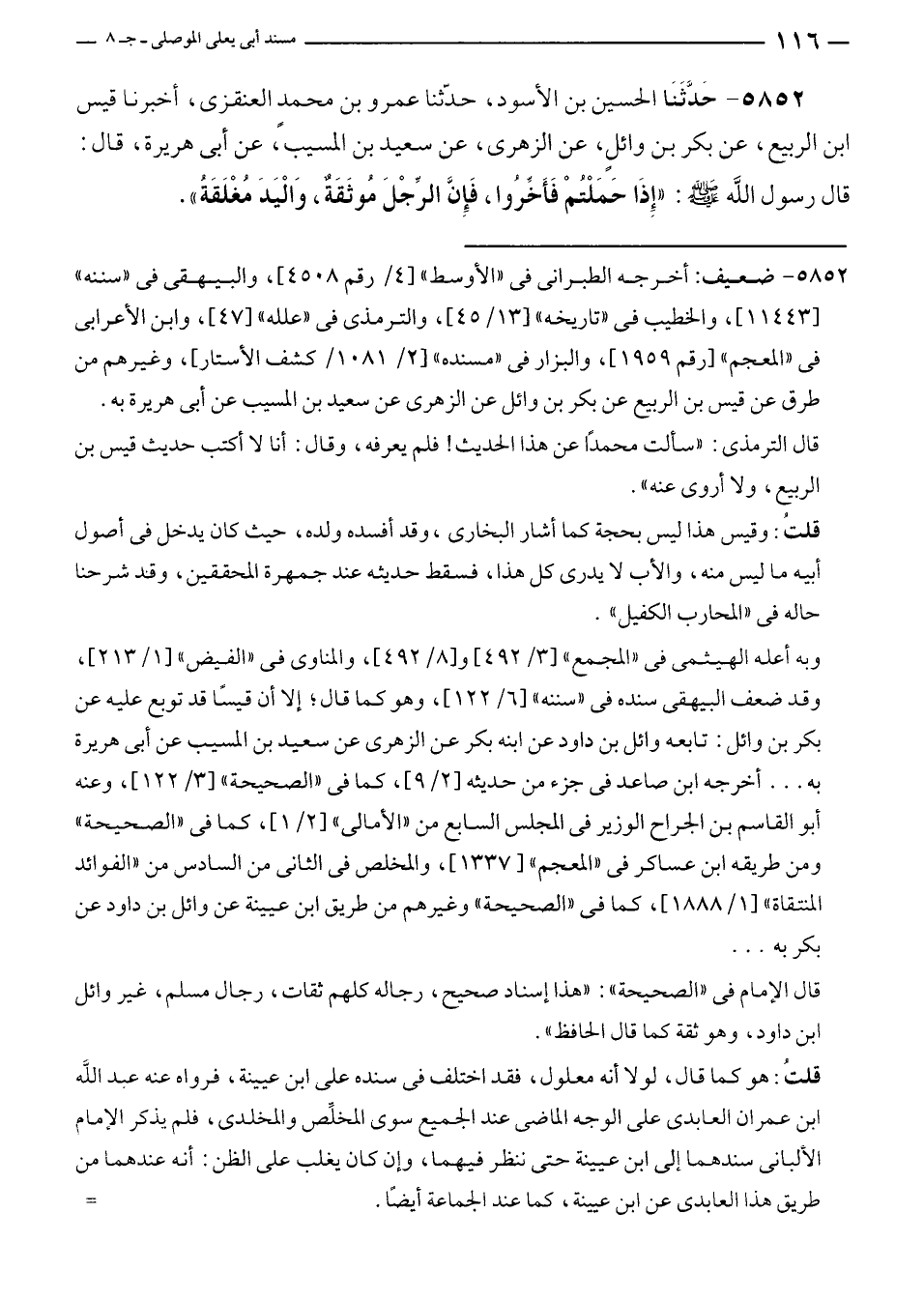 ٥٨٥٢ - حَدَّثَنَا الحسين بن الأسود، حدّثنا عمرو بن محمدٍ العنقزى، أخبرنا قيس بن الربيع، عن بكر بن وائلٍ، عن الزهرى، عن سعيد بن المسيب، عن أبى هريرة، قال: قال رسول الله - صلى الله عليه وسلم -: "إِذَا حَمَلْتُمْ فَأَخِّروا، فَإِن الرِّجْلَ مُوثَقَةٌ، وَالْيَدَ مُغْلَقَةُ".