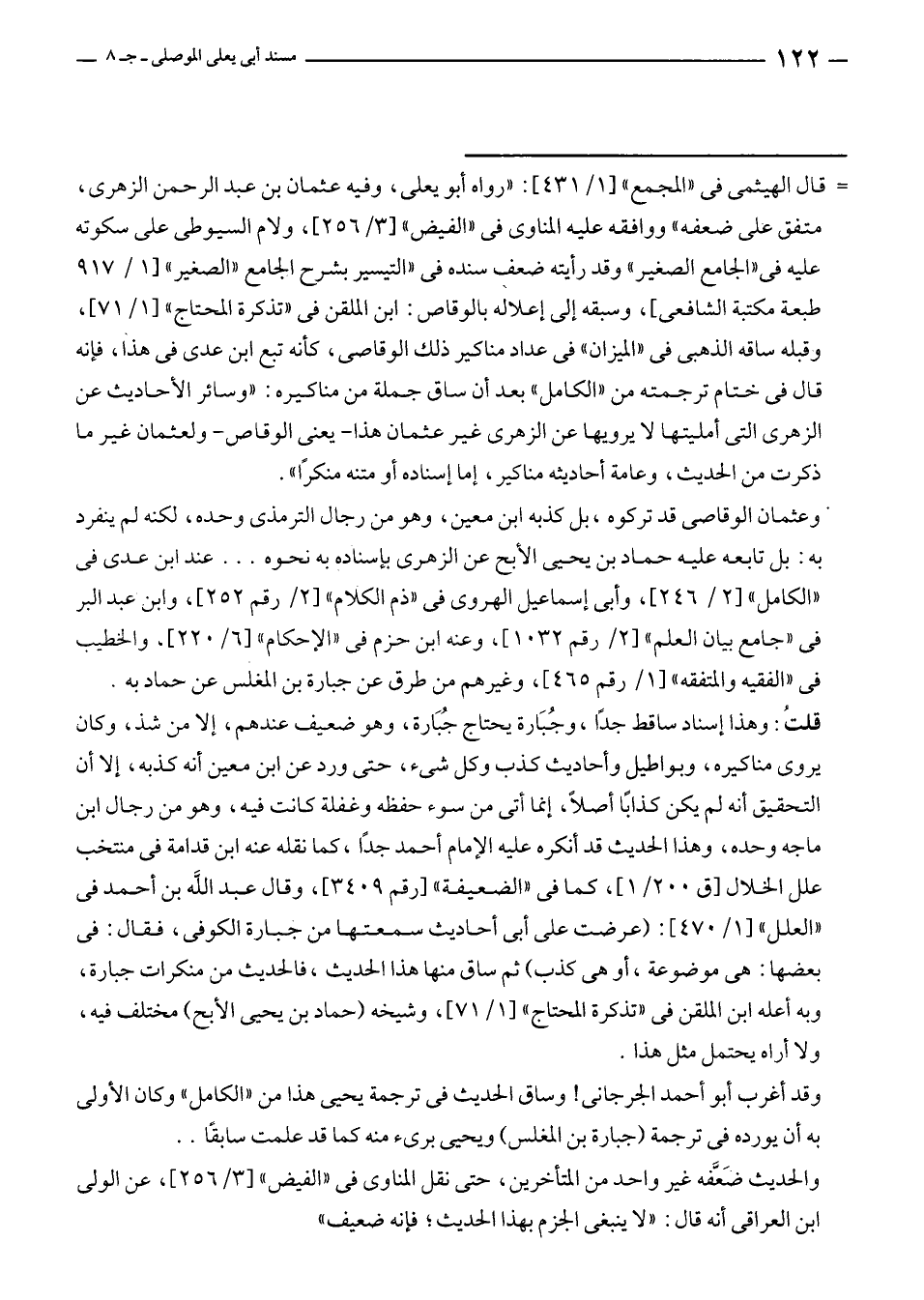 = قال الهيثمى في "المجمع" [١/ ٤٣١]: "رواه أبو يعلى، وفيه عثمان بن عبد الرحمن الزهرى، متفق على ضعفه" ووافقه عليه المناوى في "الفيض" [٣/ ٢٥٦]، ولام السيوطى على سكوته عليه في "الجامع الصغير" وقد رأيته ضعف سنده في "التيسير بشرح الجامع "الصغير" [١/ ٩١٧ طبعة مكتبة الشافعي]، وسبقه إلى إعلاله بالوقاص: ابن الملقن في "تذكرة المحتاج" [١/ ٧١]، وقبله ساقه الذهبى في "الميزان" في عداد مناكير ذلك الوقاصى، كأنه تبع ابن عدى في هذا، فإنه قال في ختام ترجمته من "الكامل" بعد أن ساق جملة من مناكيره: "وسائر الأحاديث عن الزهرى التى أمليتها لا يرويها عن الزهرى غير عثمان هذا - يعنى الوقاص - ولعثمان غير ما ذكرت من الحديث، وعامة أحاديثه مناكير، إما إسناده أو متنه منكرًا".