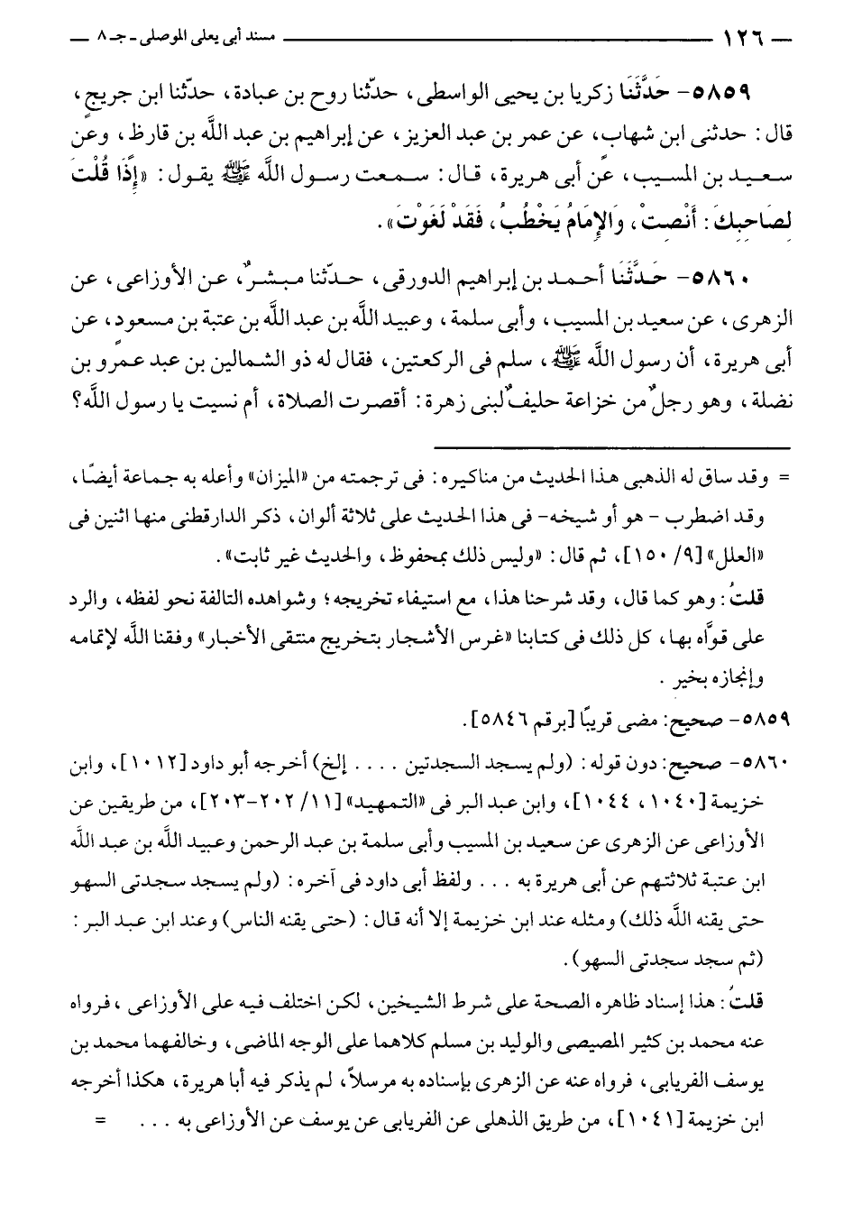 ٥٨٦٠ - حَدَّثَنَا أحمد بن إبراهيم الدورقى، حدّثنا مبشر، عن الأوزاعى، عن الزهرى، عن سعيد بن المسيب، وأبى سلمة، وعبيد الله بن عبد الله بن عتبة بن مسعودٍ، عن أبى هريرة، أن رسول الله - صلى الله عليه وسلم -، سلم في الركعتين، فقال له ذو الشمالين بن عبد عمرو بن نضلة، وهو رجلٌ من خزاعة حليفٌ لبنى زهرة: أقصرت الصلاة، أم نسيت يا رسول الله؟
