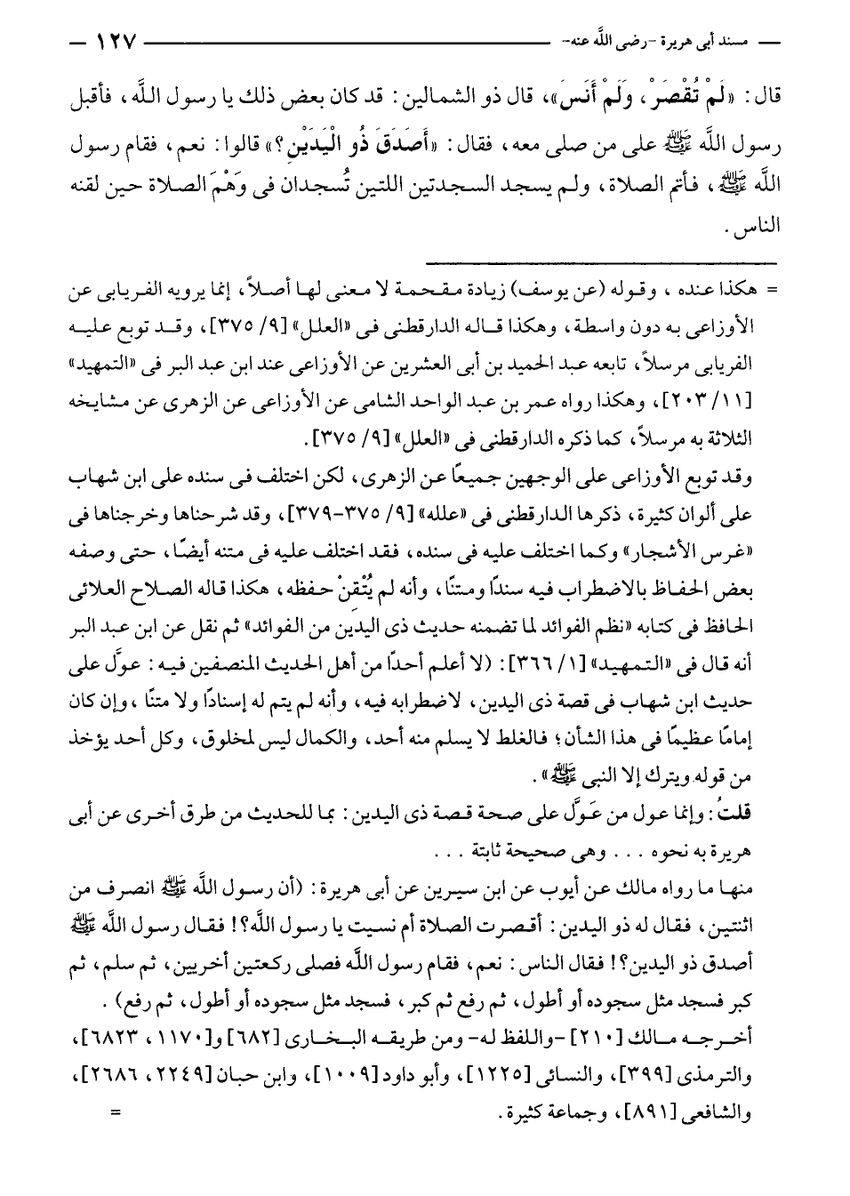 قلتُ: وإنما عول من عَوَّل على صحة قصة ذى اليدين: بما للحديث من طرق أخرى عن أبى هريرة به نحوه ... وهى صحيحة ثابتة ...