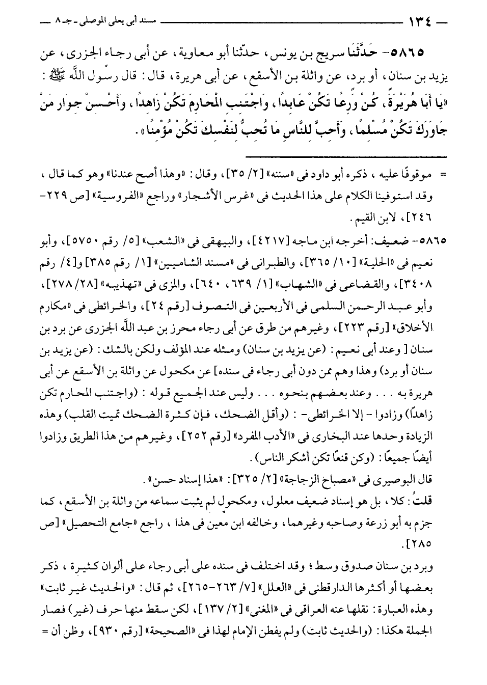 ٥٨٦٥ - حَدَّثَنَا سريج بن يونس، حدّثنا أبو معاوية، عن أبى رجاءٍ الجزرى، عن يزيد بن سنان، أو بردٍ، عن واثلة بن الأسقع، عن أبى هريرة، قال: قال رسول الله - صلى الله عليه وسلم -: "يَا أَبَا هُرَيْرَةَ، كُنْ وَرِعًا تَكُنْ عَابِدًا، وَاجْتَنِبِ المحَارِمَ تَكُنْ زَاهِدًا، وأَحْسِنْ جِوَار مَنْ جَاوَرَكَ تَكُنْ مُسْلِمًا، وَأَحِبَّ لِلنَّاسِ مَا تُحِبُّ لِنَفْسِكَ تَكُنْ مُؤْمِنًا".