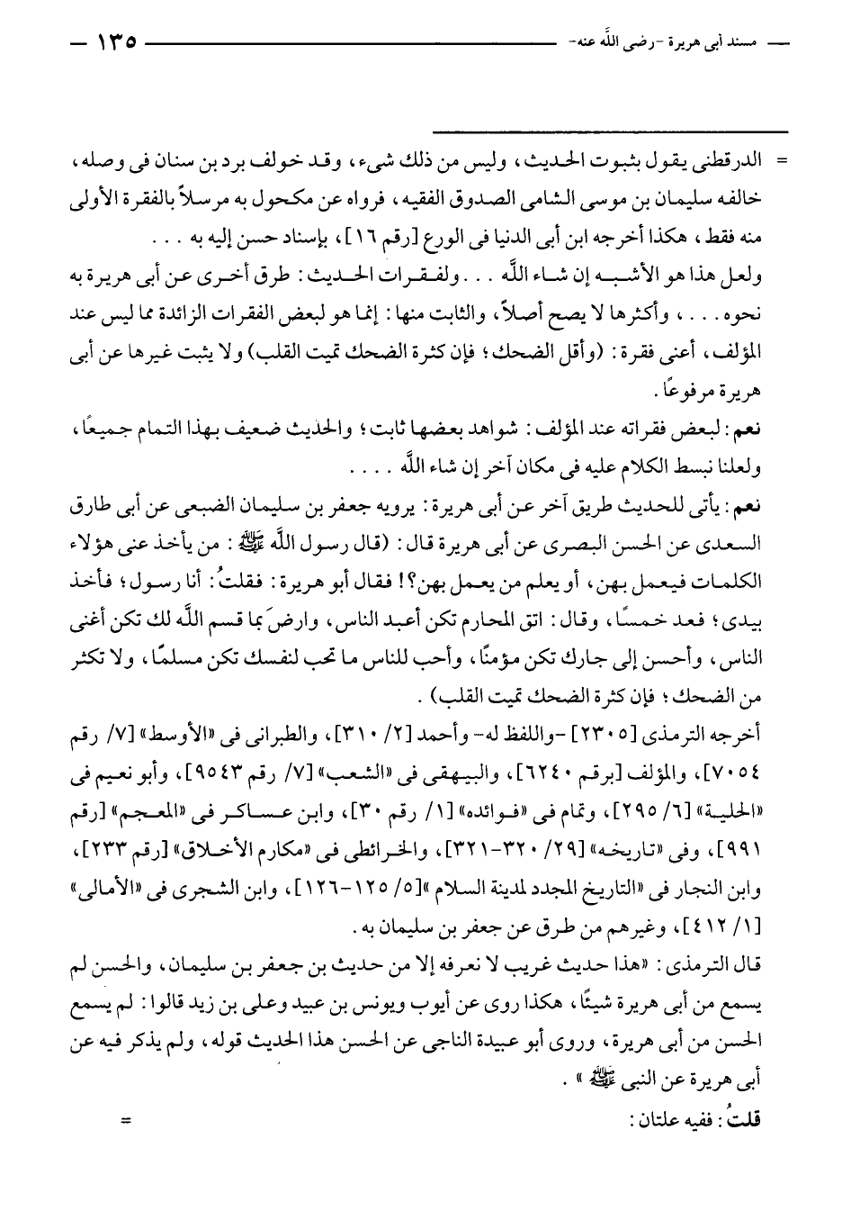 ولعل هذا هو الأشبه إن شاء الله ... ولفقرات الحديث: طرق أخرى عن أبى هريرة به نحوه ... ، وأكثرها لا يصح أصلًا، والثابت منها: إنما هو لبعض الفقرات الزائدة مما ليس عند المؤلف، أعنى فقرة: (وأقل الضحك؛ فإن كثرة الضحك تميت القلب) ولا يثبت غيرها عن أبى هريرة مرفوعًا.