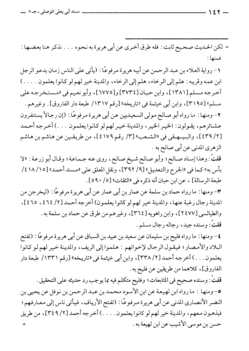 ١ - رواية العلاء بن عبد الرحمن عن أبيه هريرة مرفوعًا: (يأتى على الناس زمان يدعو الرجل ابن عمه وقريبه: هلم إلى الرخاء، هلم إلى الرخاء، والمدينة خير لهم لو كانوا يعلمون .... ) أخرجه مسلم [١٣٨١]، وابن حبان [٣٧٣٤] و [٦٧٧٥]، وأبو نعيم في "مستخرجه على مسلم" [٣١٩٥]، وابن أبى خيثمة في "تاريخه" [رقم ١٣١٧/ طبعة دار الفاروق]. وغيرهم.