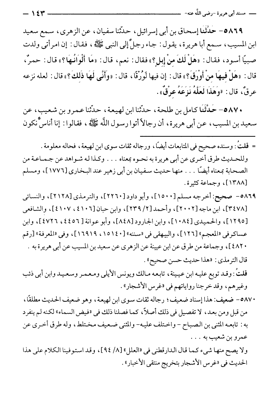 ٥٨٦٩ - حَدَّثَنَا إسحاق بن أبى إسرائيل، حدّثنا سفيان، عن الزهرى، سمع سعيد بن المسيب، سمع أبا هريرة، يقول: جاء رجلٌ إلى النبي - صلى الله عليه وسلم -، فقال: إن امرأتى ولدت صبيًا أسود، فقال: "هَلْ لَكَ مِنْ إِبِلٍ؟ " فقال: نعم، قال: "مَا أَلْوَانُهَا؟ " قال: حمرٌ، قال: "هَلْ فِيهَا مِنْ أَوْرَقَ؟ " قال: إن فيها لَوُرْقًا، قال: "وَأَنَّى لَهَا ذَلِكَ؟ " قال: لعله نزعه عرقٌ، قال: "وَهَذَا لَعَلَّهُ نَزَعَهُ عِرْقٌ".