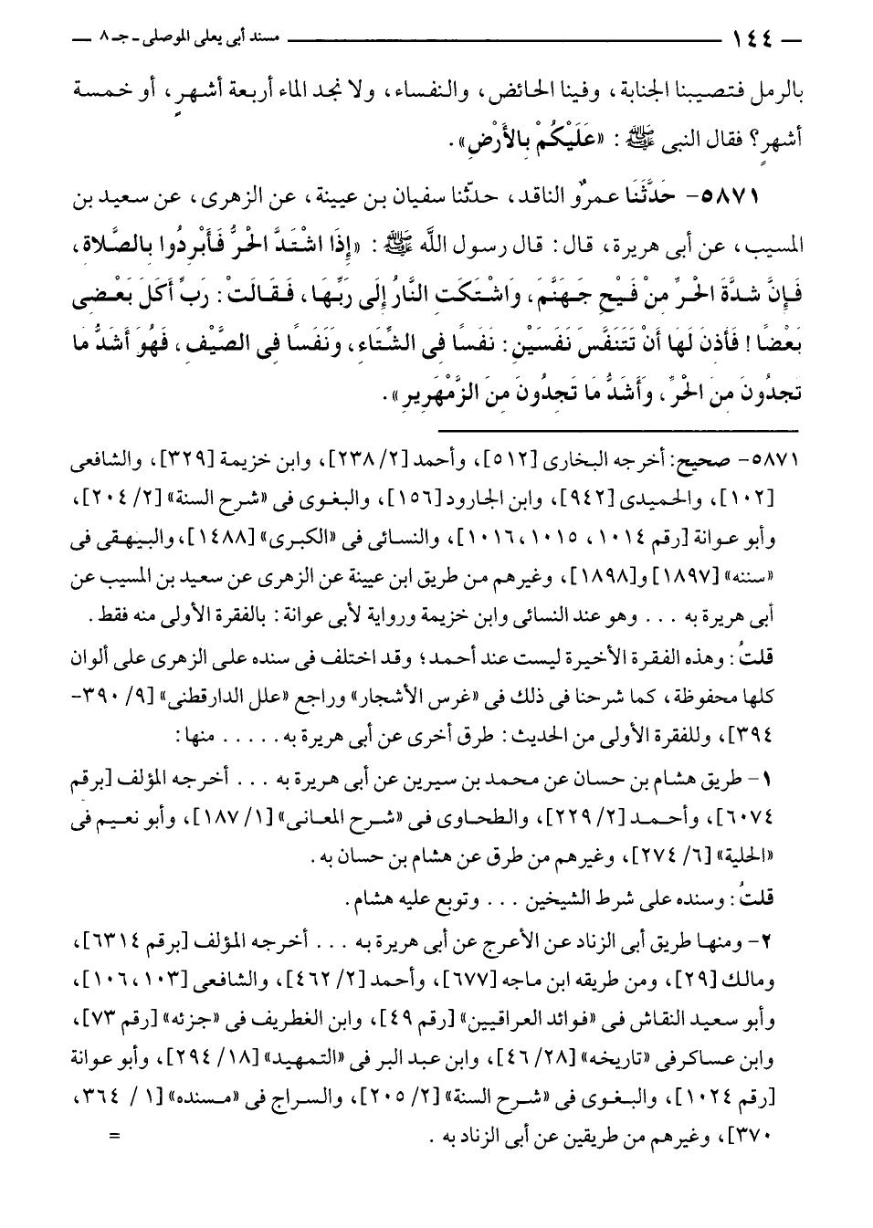٥٨٧١ - حَدَّثَنَا عمرٌو الناقد، حدّثنا سفيان بن عيينة، عن الزهرى، عن سعيد بن المسيب، عن أبى هريرة، قال: قال رسول الله - صلى الله عليه وسلم -: "إذَا اشْتَدَّ الحرُّ فَأَبْرِدُوا بِالصَّلاةِ، فَإِنَّ شدَّةَ الحرِّ مِنْ فَيْحِ جَهَنَّمَ، وَاشْتَكَتِ النَّارُ إِلَى رَبِّهَا، فَقَالَتْ: رَبِّ أَكَلَ بَعْضِى بَعْضًا فَأذِنَ لَهَا أَنْ تَتَنَفَّسَ نَفَسَيْنِ: نَفَسًا فِي الشِّتَاءِ، وَنَفَسًا فِي الصَّيْفِ، فَهُوَ أَشَدُّ مَا تجدُونَ منَ الحرِّ، وَأَشَدُّ مَا تَجِدُونَ مِنَ الزَّمْهَرِيرِ".